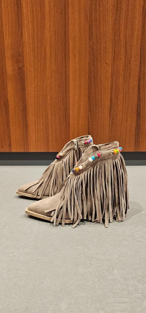 Stivale 297 camoscio beige con ricamo e frange