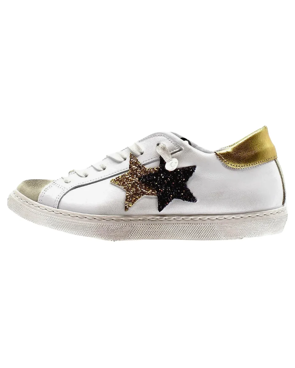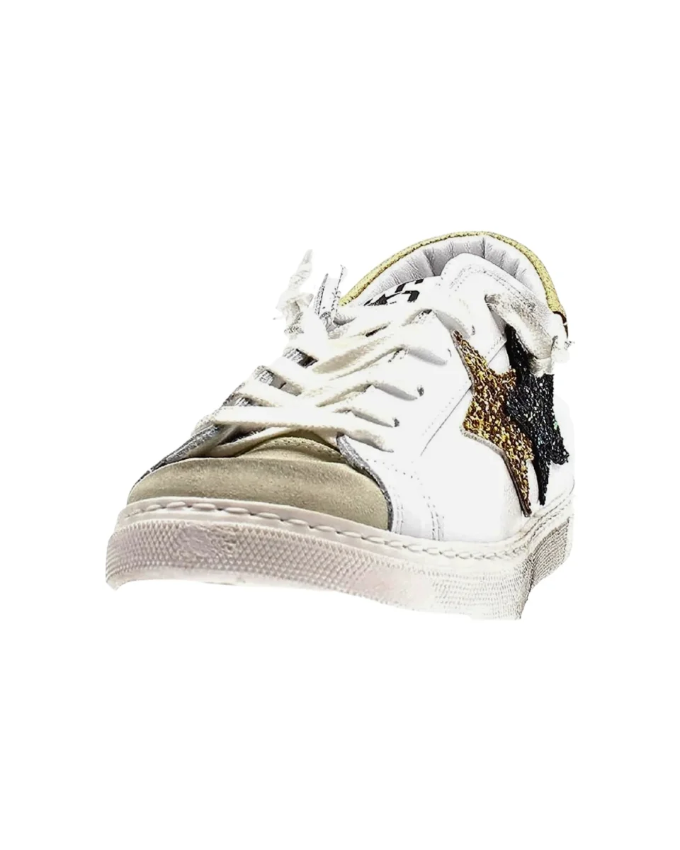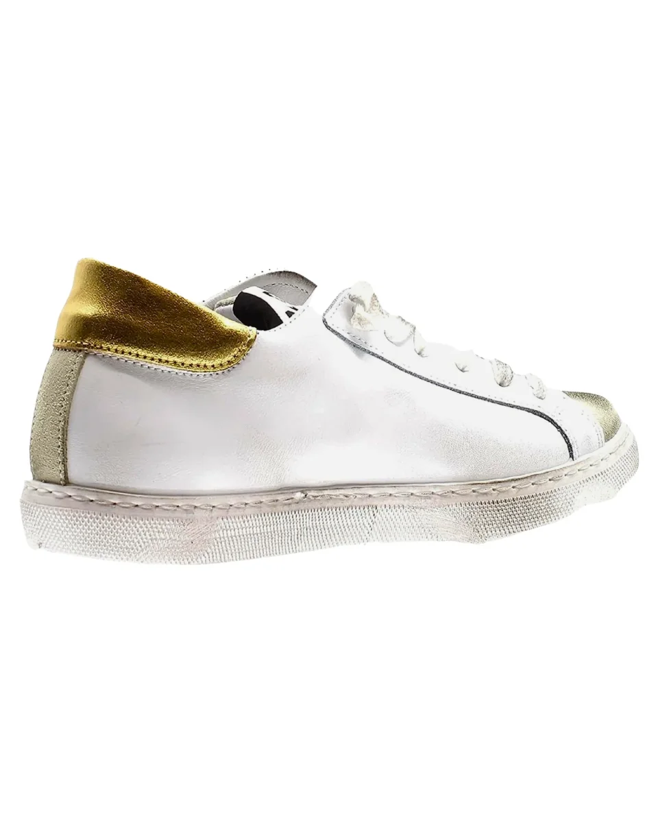 Sneakers 2Star modello Low effetto ‘used’ in pelle bovina bianca con dettagli color oro, etichetta logo cucita sulla lingua.