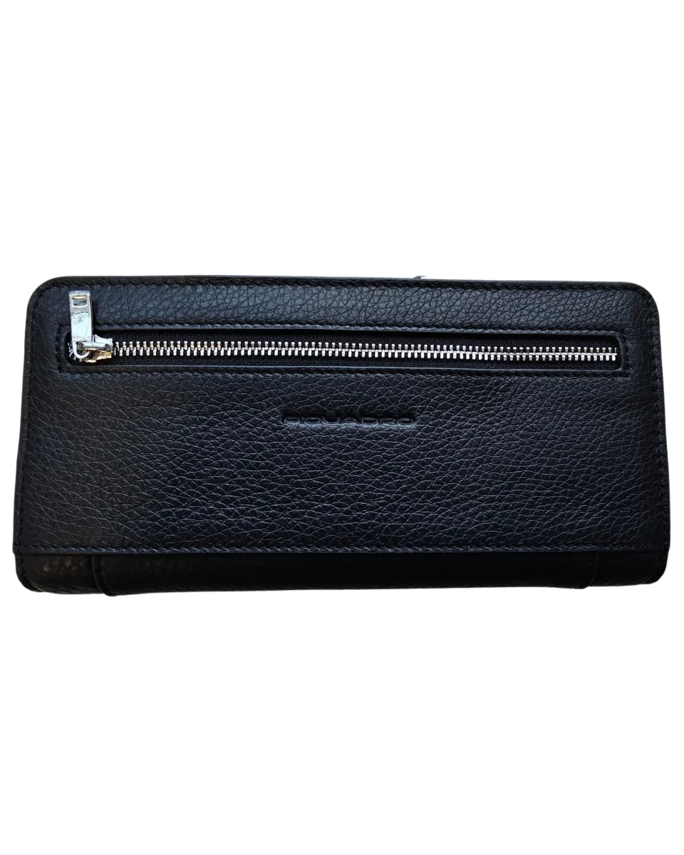 Portafoglio dotato di doppio scomparto porta banconote, 6 tasche porta carte di credito, portamonete con bottone a pressione, flap con tasca porta documenti.