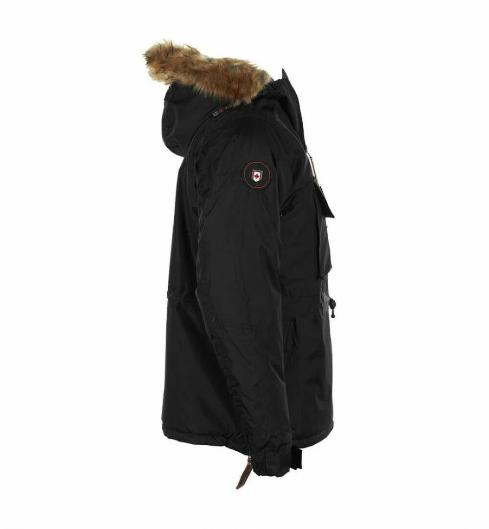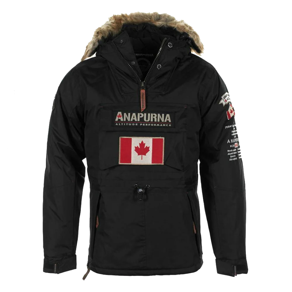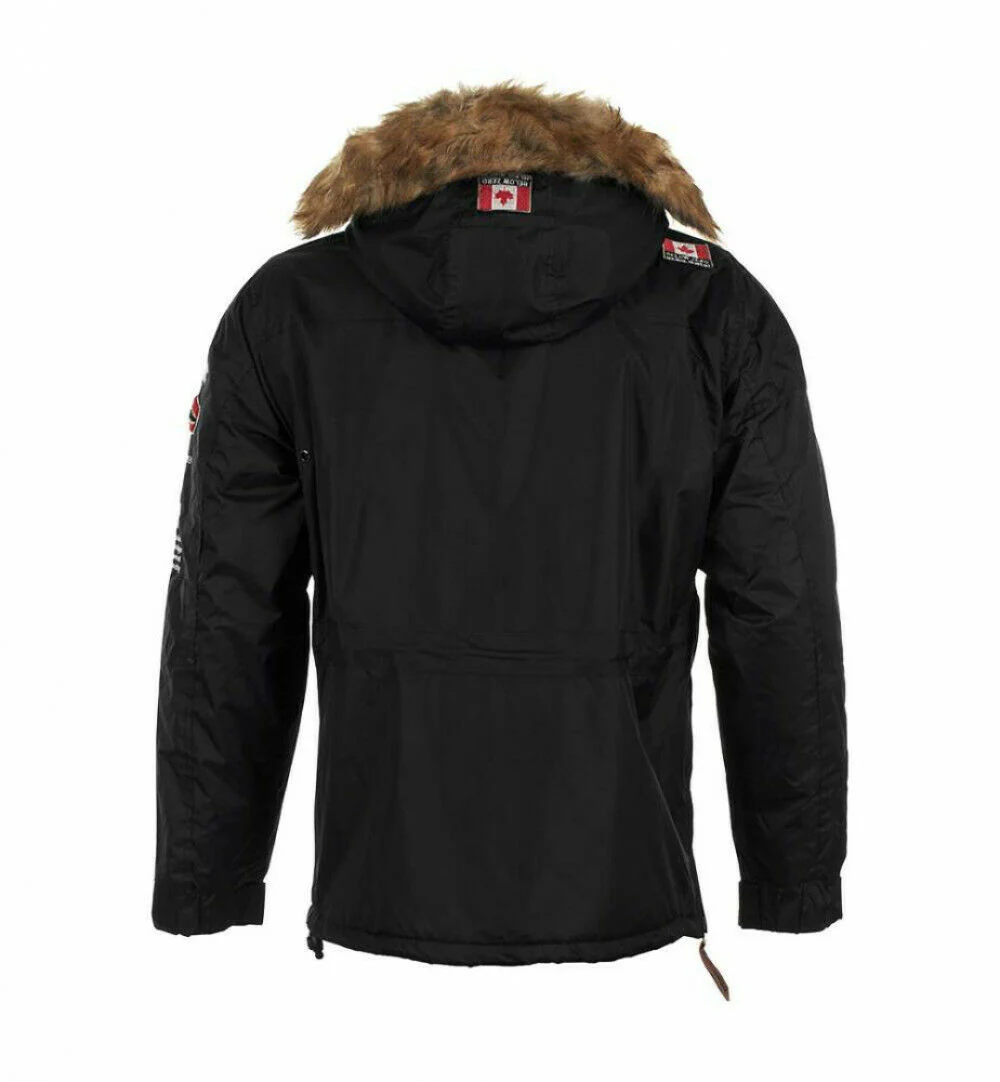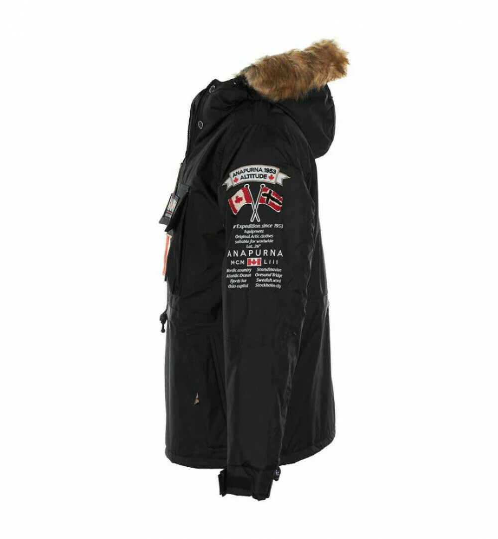 PULL-OVER HALF ZIPPER PADDED PARKA WITH FIXED HOOD, DETACHABLE FUR, PATCHED POCKET WITH EMBROIDED VELCRO FLAP ON CENTER FRONT, ADJUSTABLE CUFFS, PATCHED POCKET ON SLEEVE, EMBRODERY ON SLEEVE, ADJUSTING DRAWSTRING AT WAIST AND AT THE BOTTOM OF THE GARMENT, ZIP