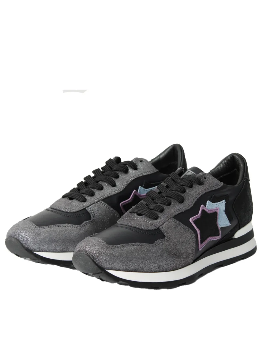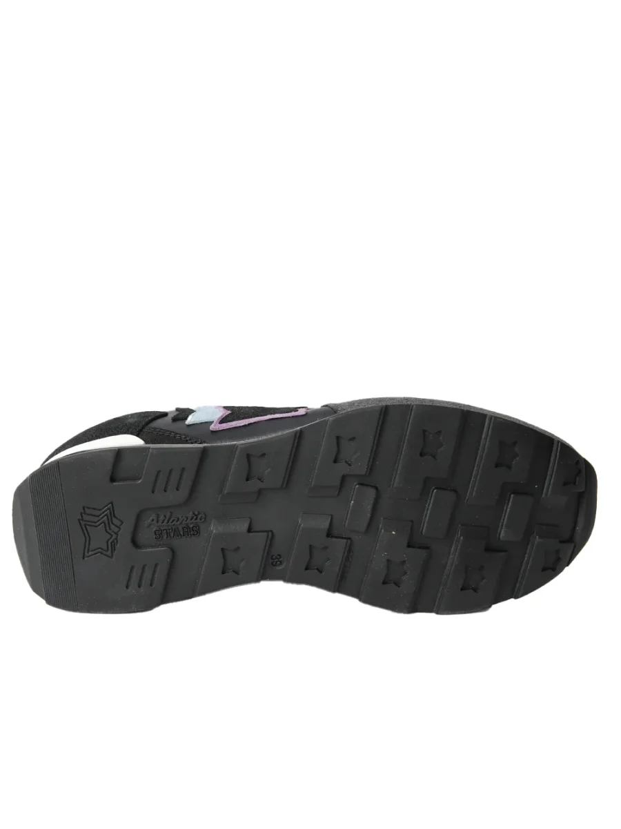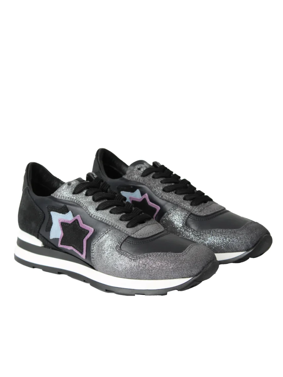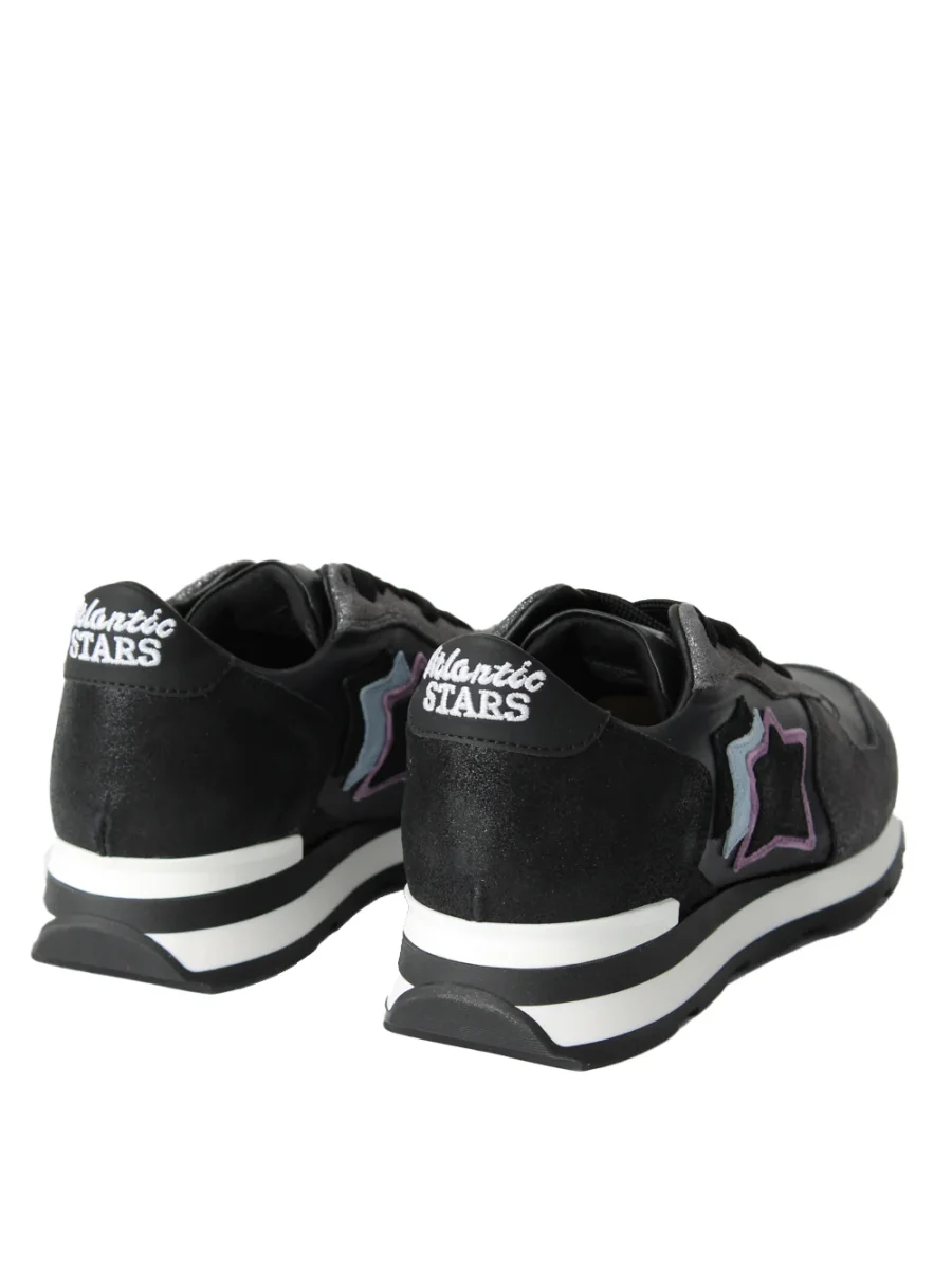 Scarpe realizzate in camoscio nero e tessuto strass, con stelle applicate e linguetta con etichetta legata. Scuola running in gomma colorata, rigorosamente Made in Italy.
