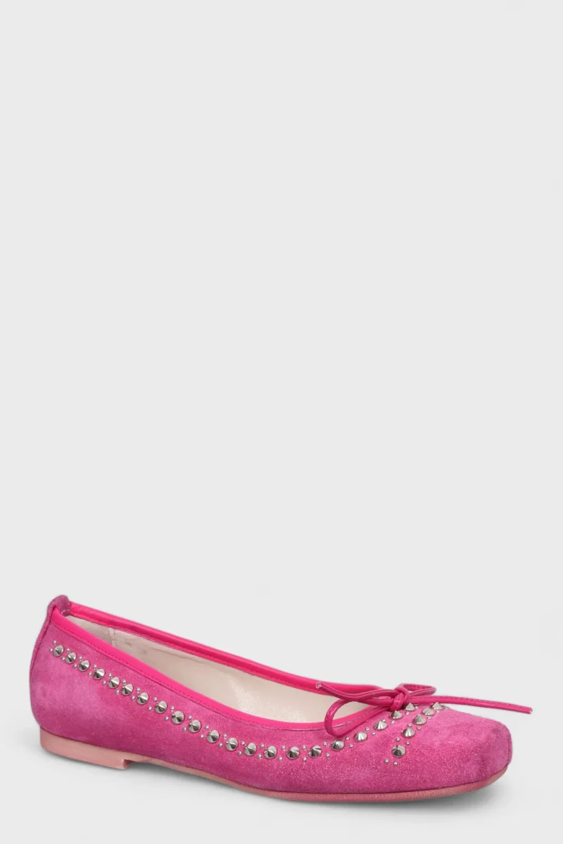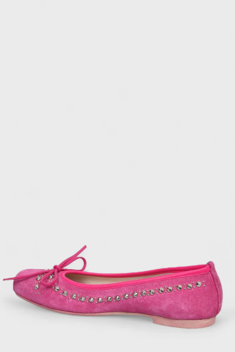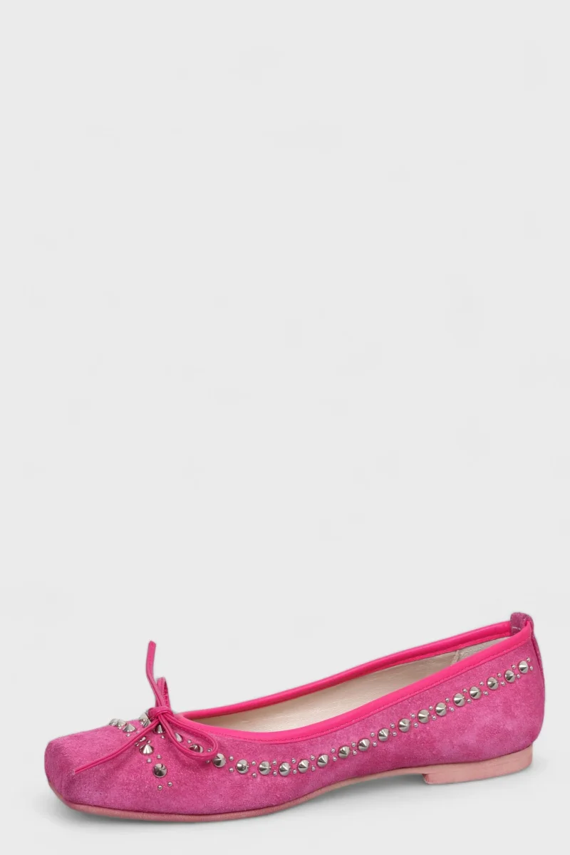 Ballerina in camoscio fucsia con riporto in pelle e borchie nel colore argento, interni in similpelle, suola in tunit neutra, altezza 2.5, calzano regolari, realizzate in modo artigianale, rigorosamente made in Italy.