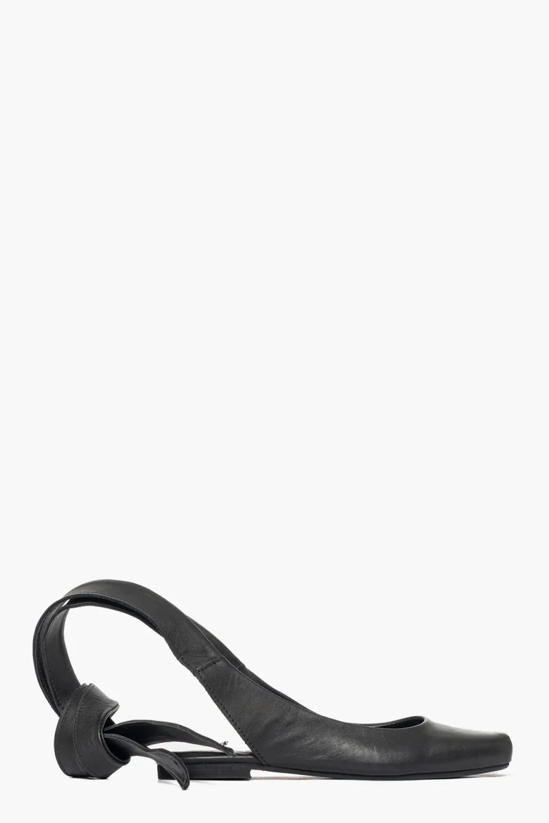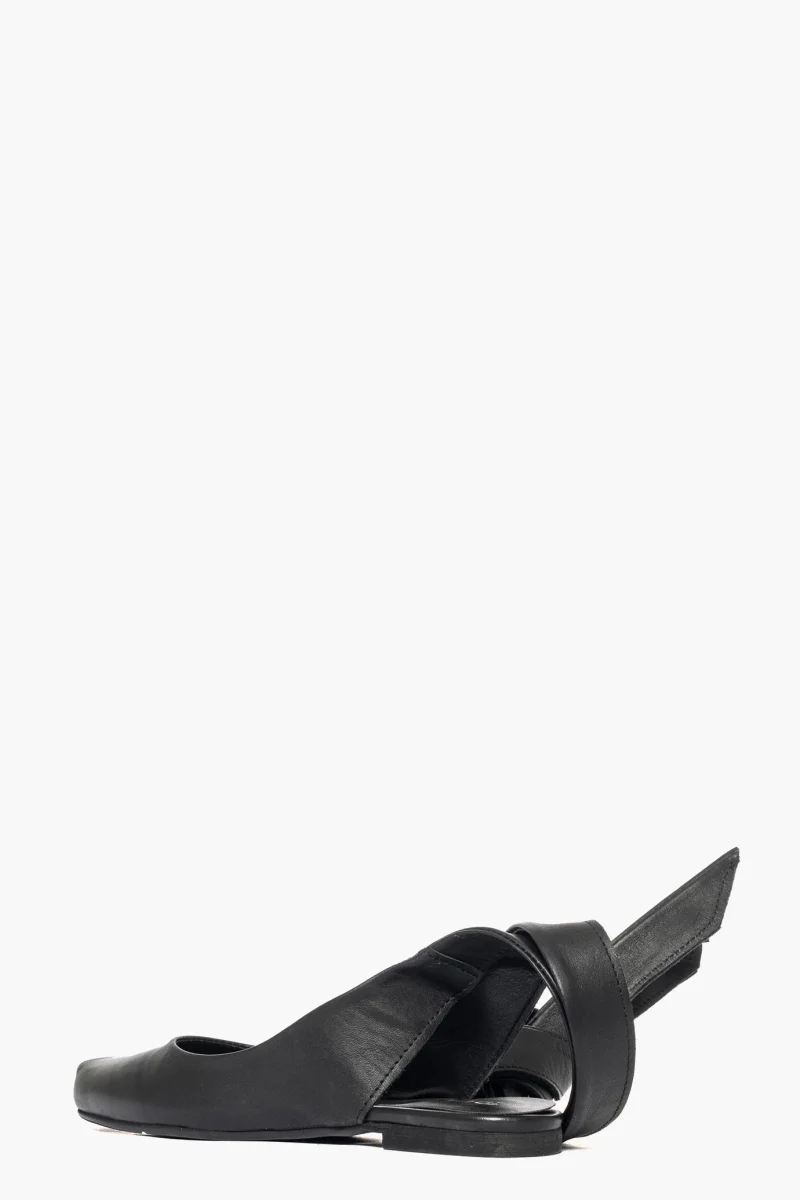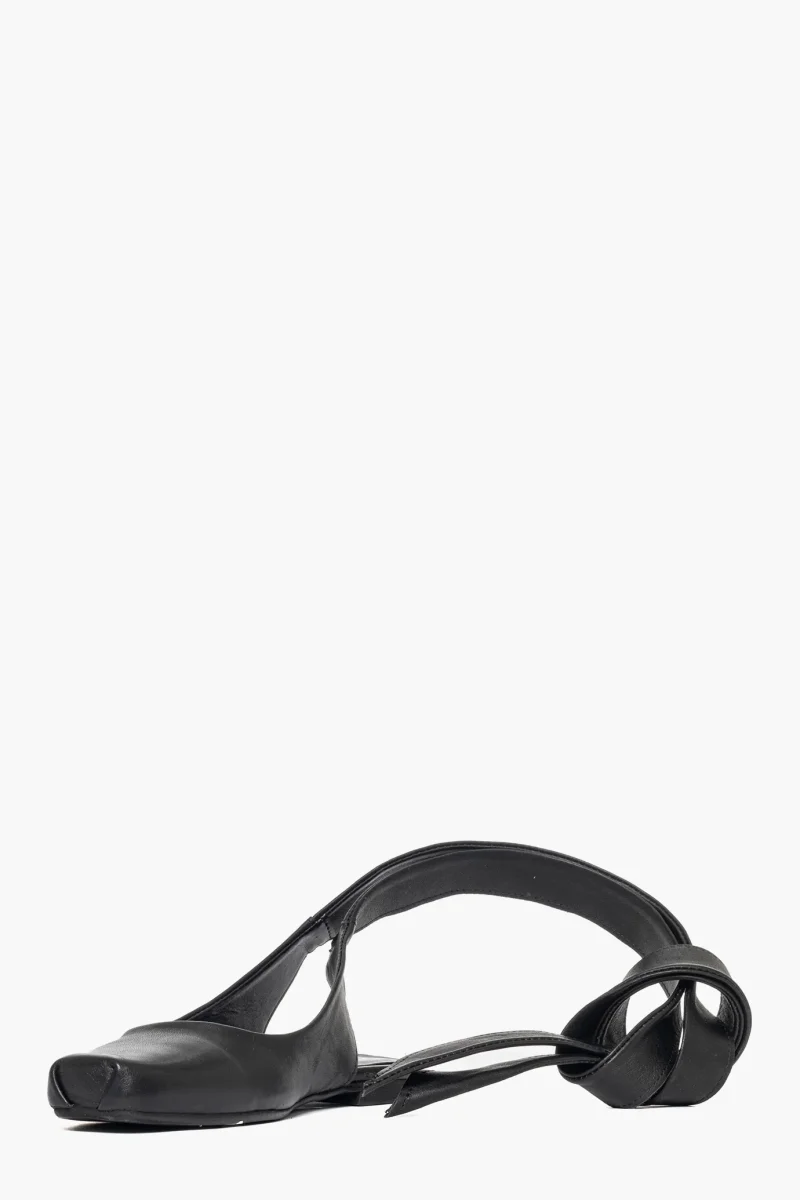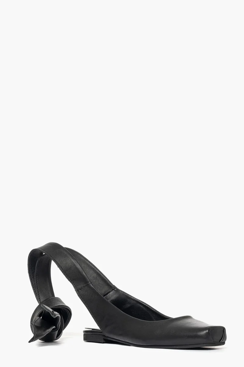 Ballerina in pelle nero con laccio alla caviglia in pelle, punta quadrata, interni in similpelle, aperto al tallone. Calzano regolari. Calzature realizzate in modo artigianale, rigorosamente made in Italy.