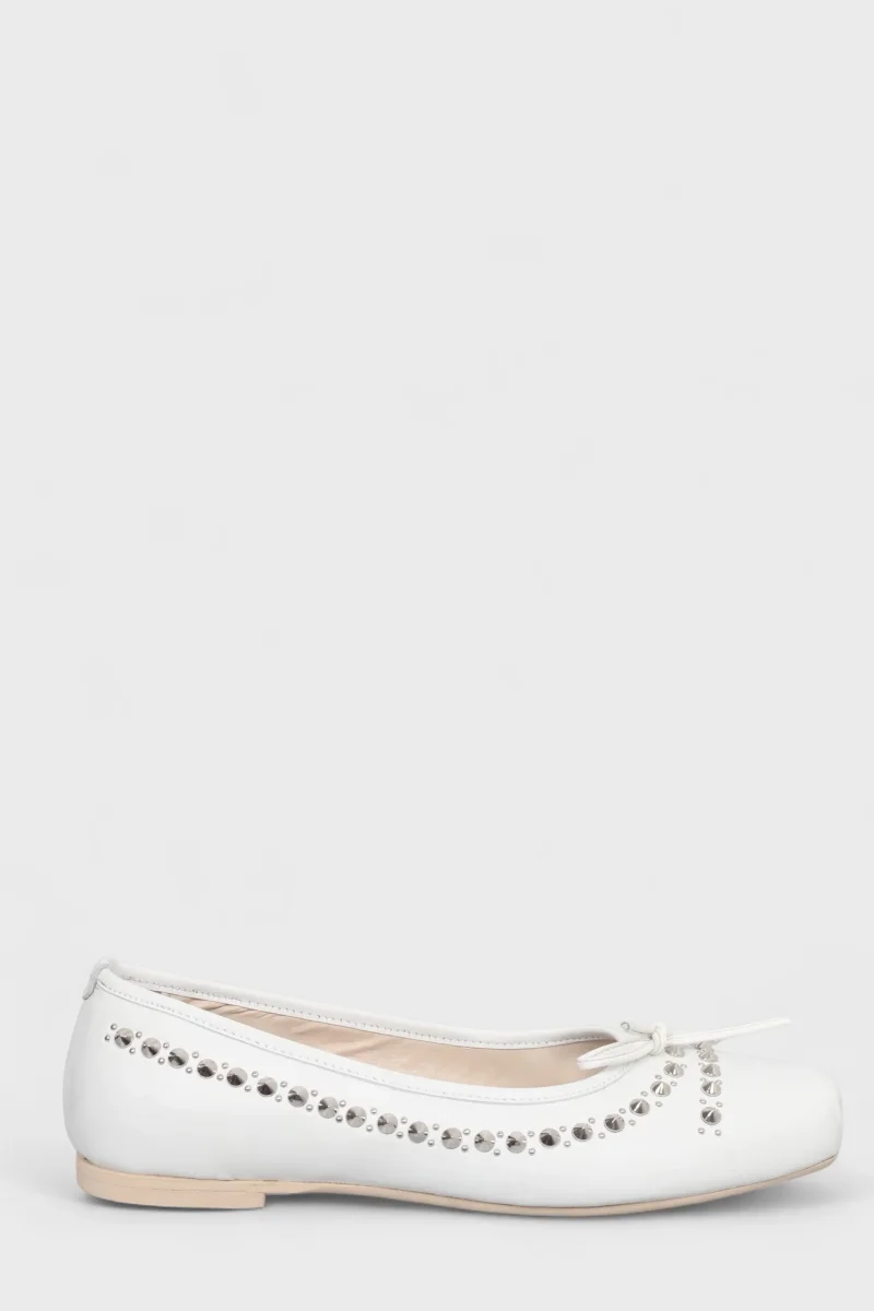 Ballerina in pelle bianco con borchie nel colore argento, interni in similpelle, suola in tunit neutra, altezza 2.5, calzano regolari, realizzate in modo artigianale, rigorosamente made in Italy.