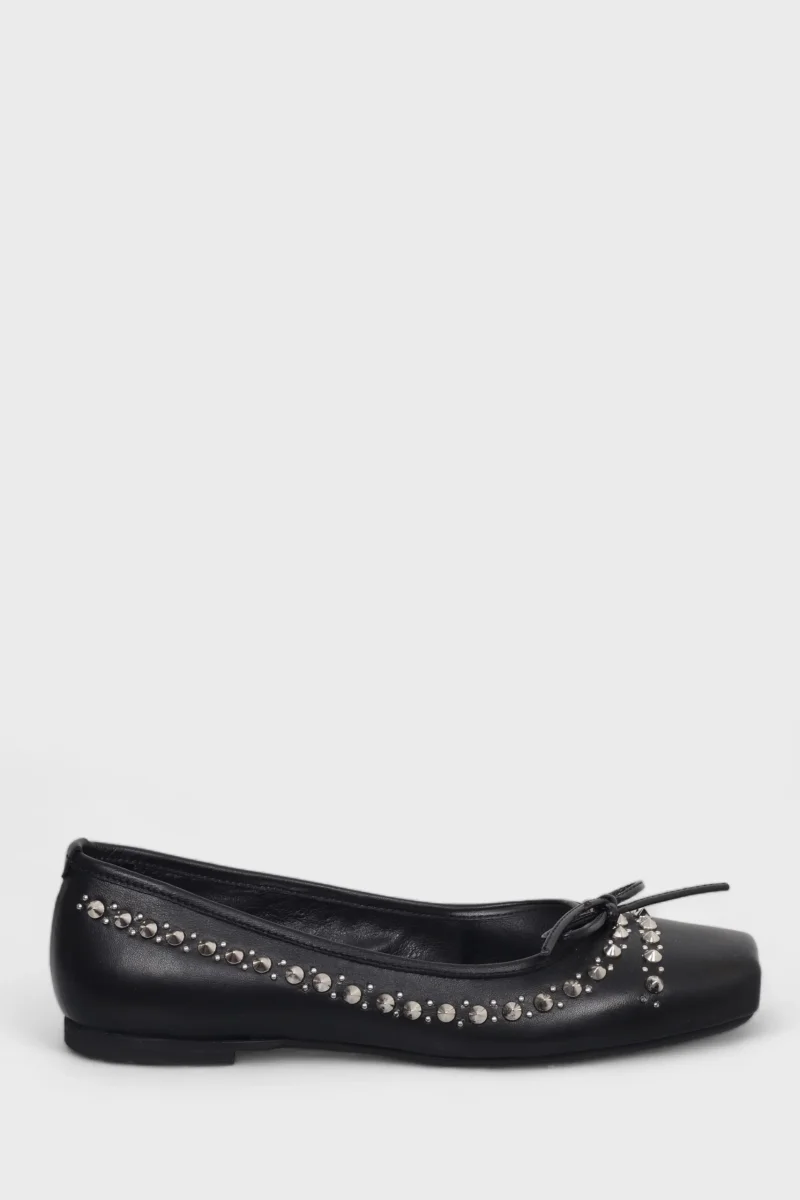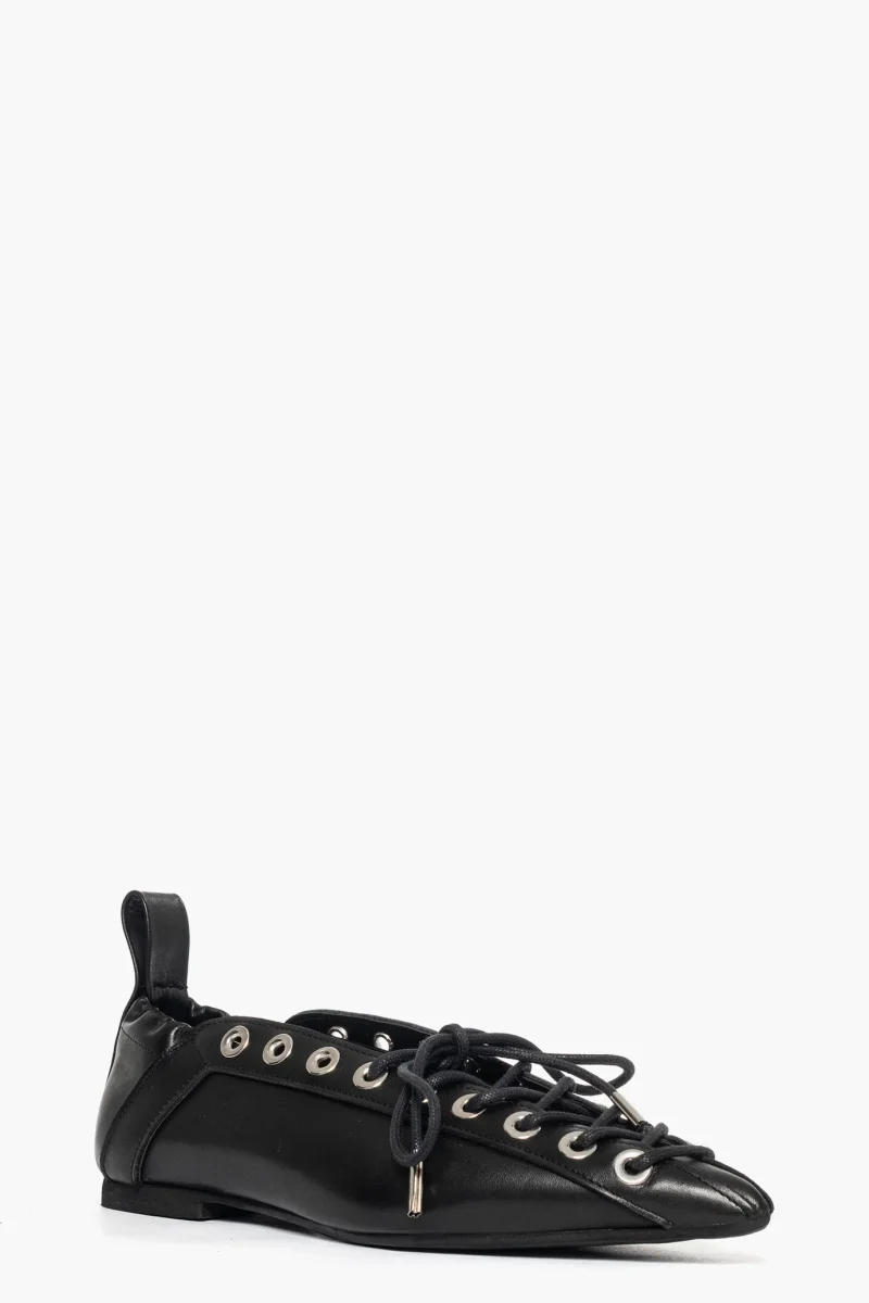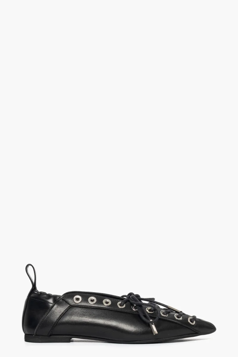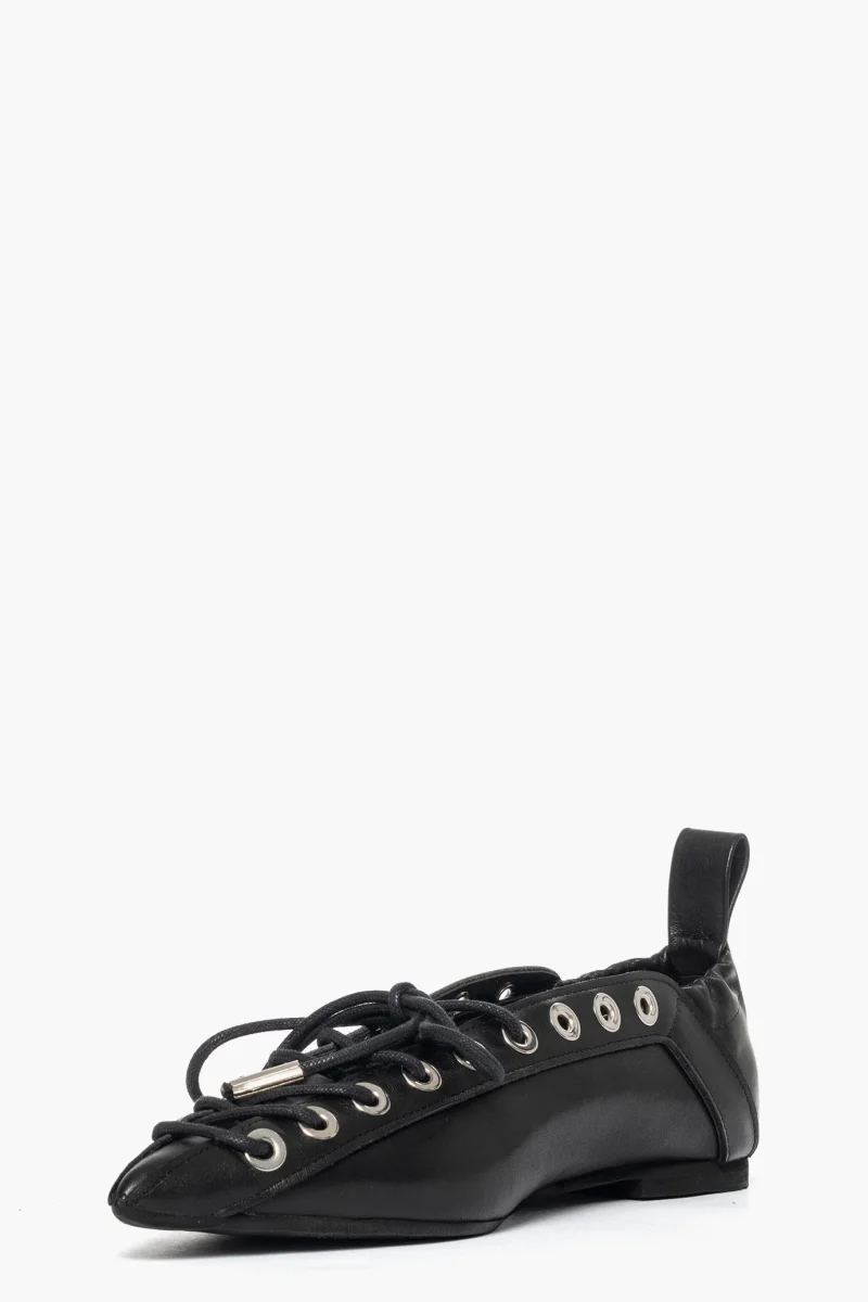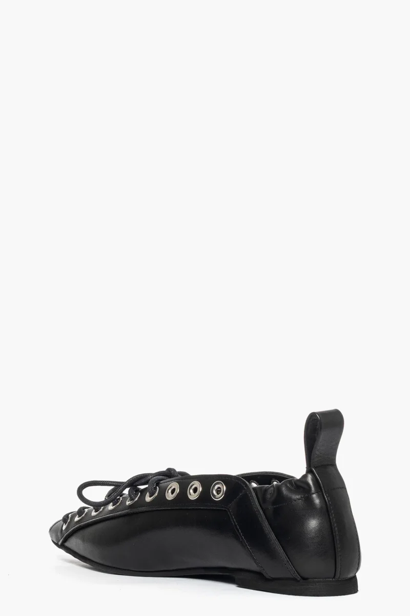 Ballerina in pelle nero con laccio nero, occhielli nel colore argento, punta in avanti, suola in tunit neutra spazzolata in tinta, altezza 2. Calzano giuste. Calzature artigianali, made in Italy.