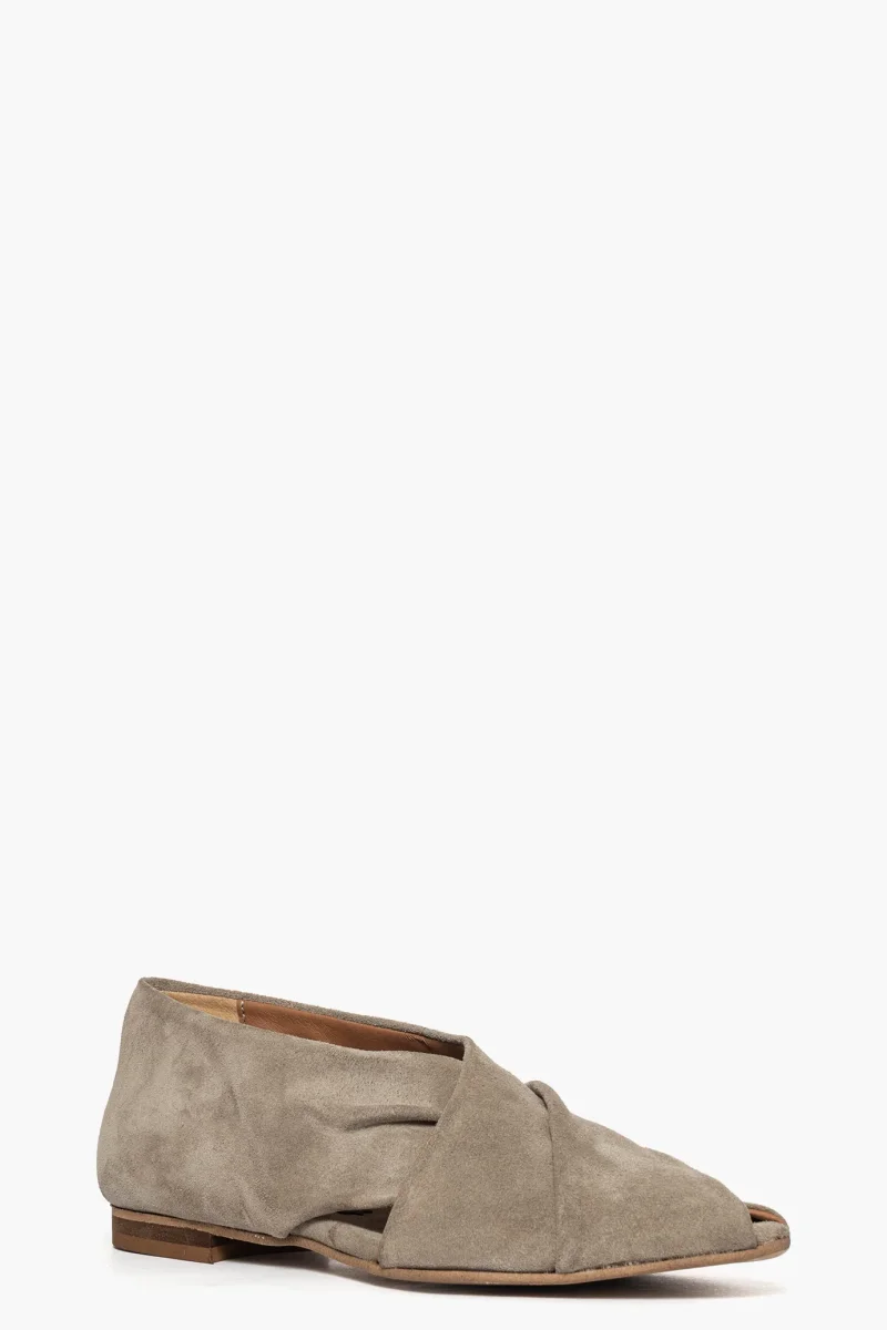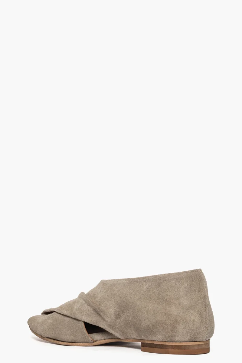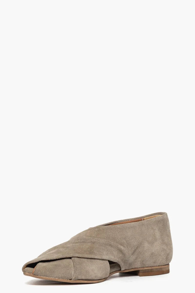 Bambolina in camoscio taupè punta chiusa e aperta ai lati come un incrocio sul collo piede, interni in similpelle, suola nel colore neutro spazzolato, altezza 1-2, punta stretta in avanti. Calzano giuste, calzature artigianali, made in Italy.