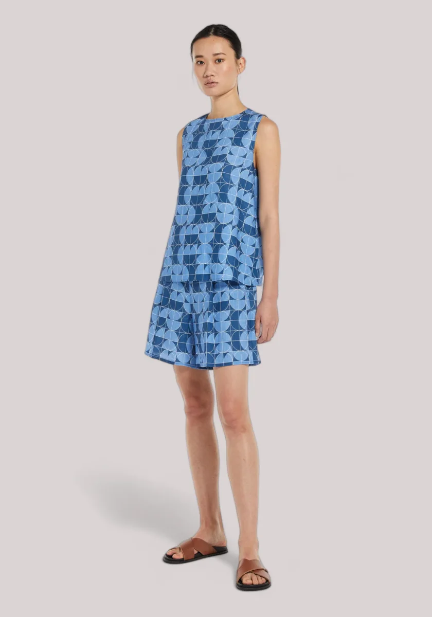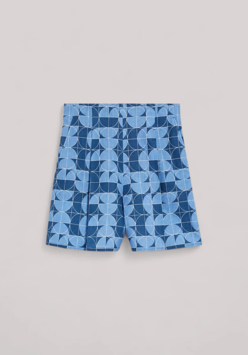 Short in tessuto di puro lino stampato, caratterizzato da una silhouette con vita regolare e tasche laterali. La vita elasticizzata solo sul retro, assicura il massimo comfort e una piacevole vestibilità . Chiusura con zip sul fianco. Lunghezza 45 cm.