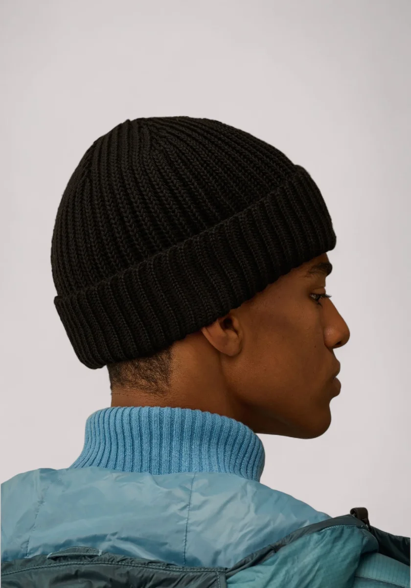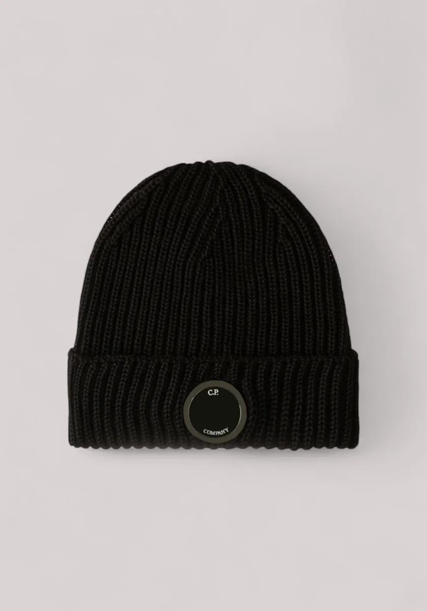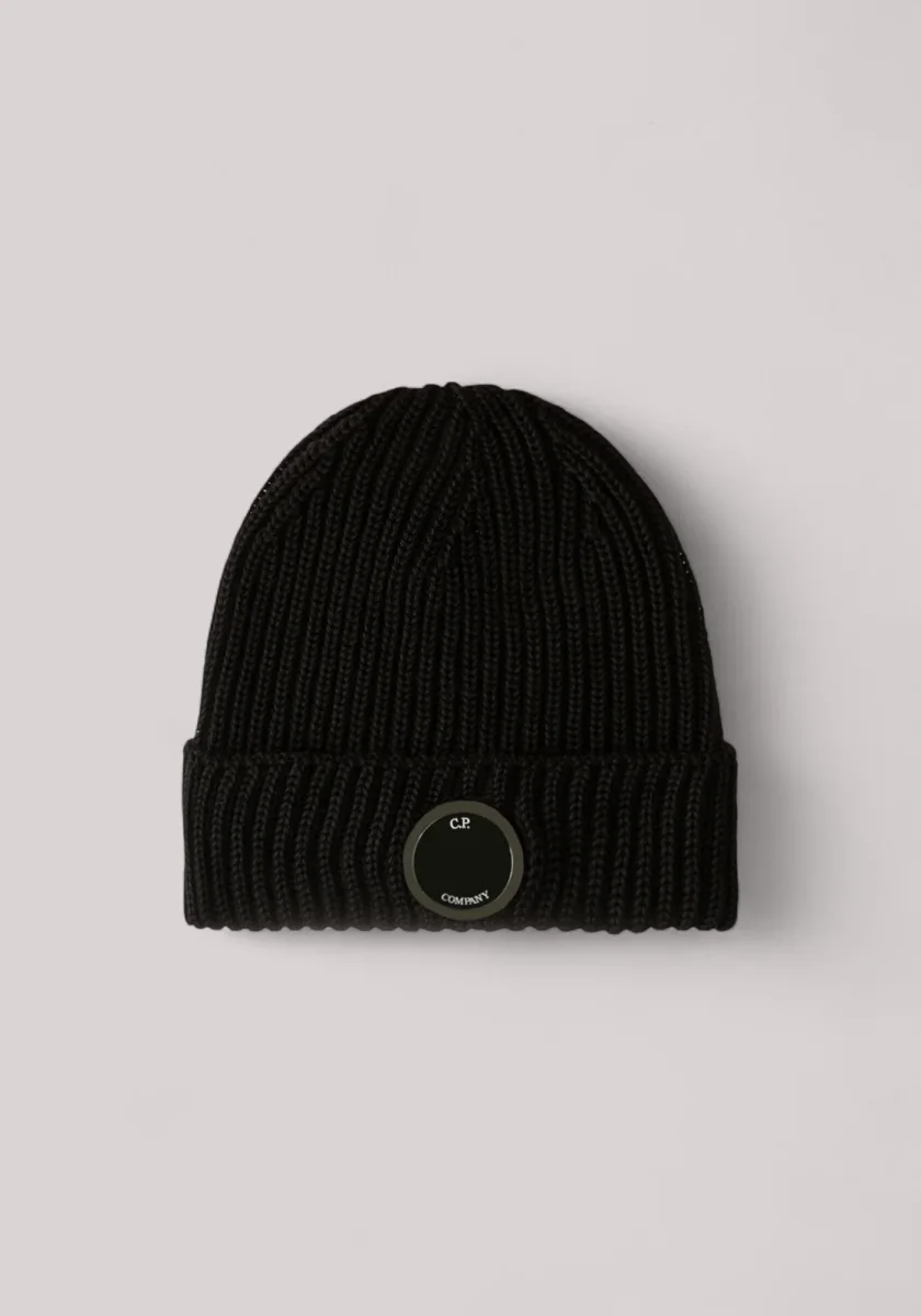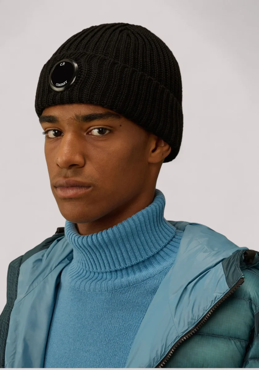 Beanie realizzato in lana merino extrafine, che garantisce morbidezza e calore. Il beanie presenta una lavorazione in maglia a costine, risvolto e l’iconica Lente di C.P. Company.