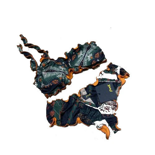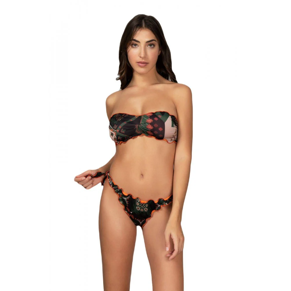Costume da bagno, collezione SS22 del Mood Rough. Bikini Donna, modello fascia con slip nodi Brasiliano regolabile in tessuto Lycra a fantasia, arricciato sui bordi. Capo dotato di imbottitura interna estraibile e laccetto removibile annodabile al collo.