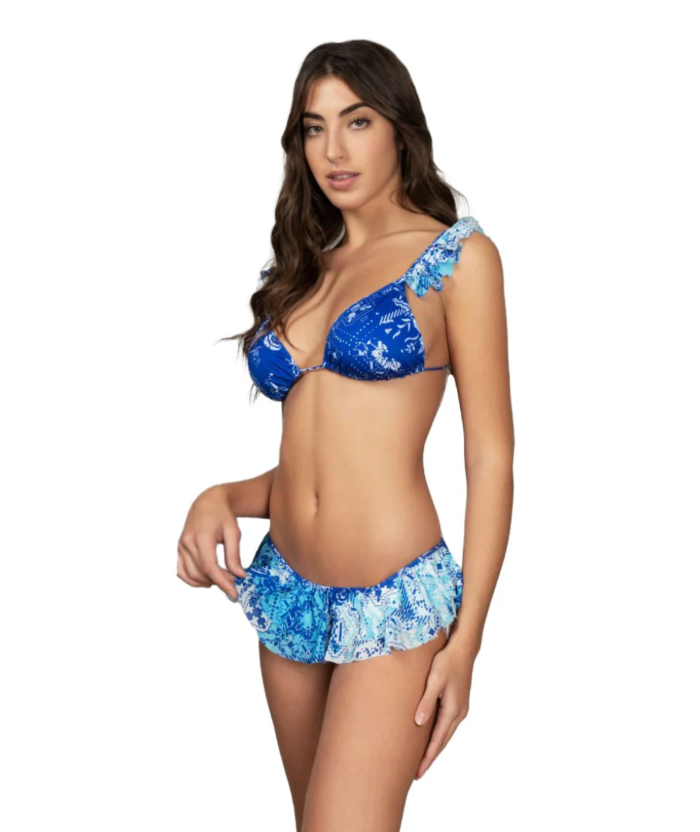 Costume da bagno, collezione SS22 del Mood Floating. Bikini Donna, modello triangolo alto con slip fianco Brasilano fisso a gonnellino, in tessuto lycra fantasia e chiffon a taglio vivo. Capo dotato di imbottitura interna estraibile.
