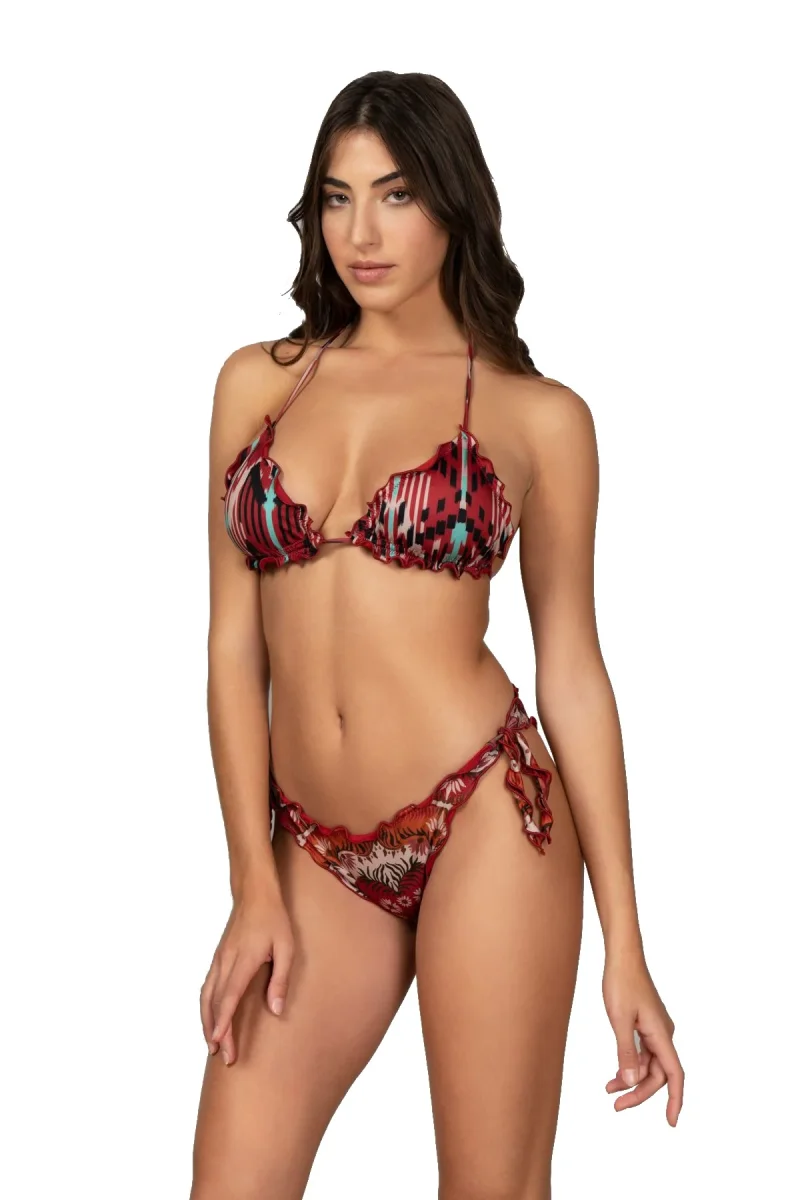 Costume da bagno, collezione SS22 del Mood Rough. Bikini Donna, modello triangolo con slip nodi Brasiliano regolabile in tessuto Lycra a fantasia, arricciato sui bordi. Capo dotato di imbottitura interna estraibile.