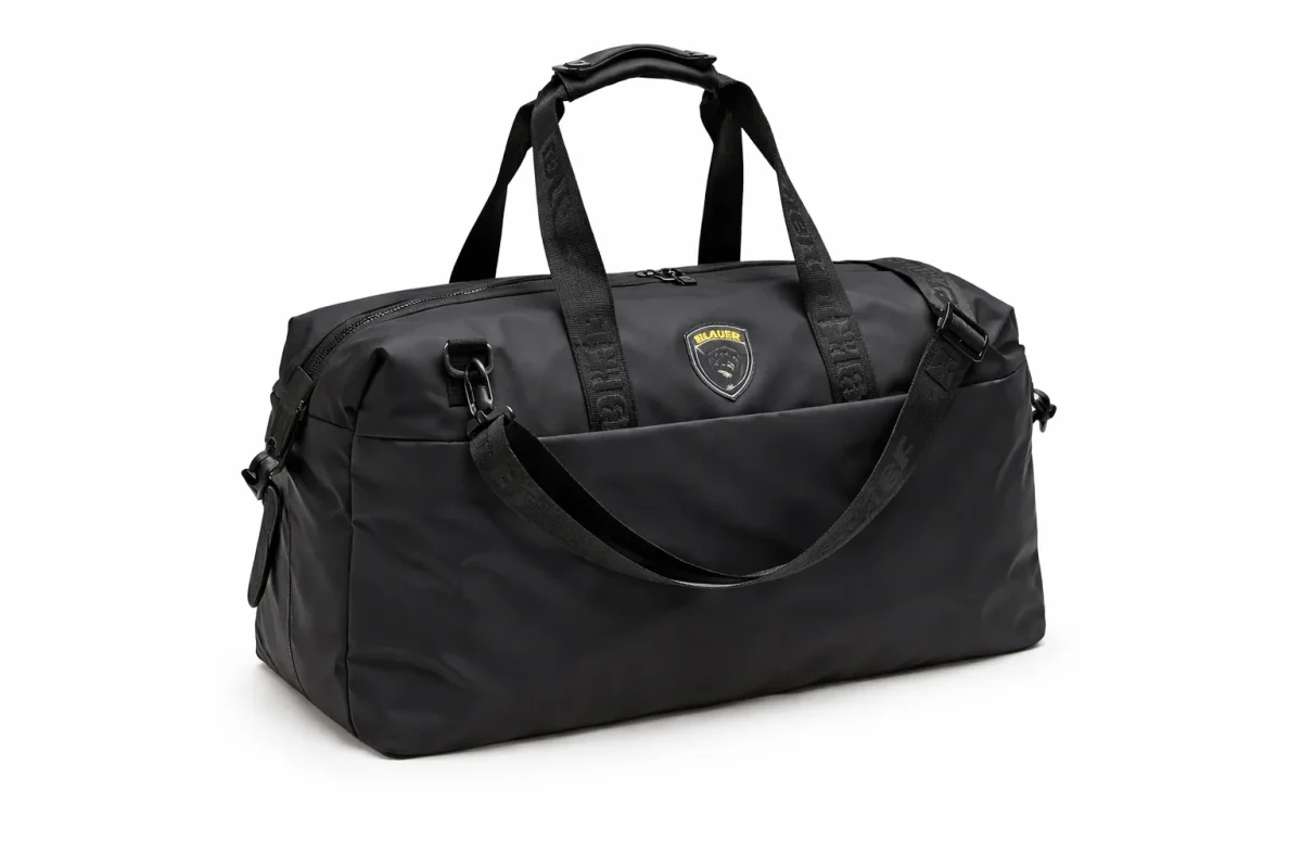 Il borsone, di dimensioni medie, è ideale per lo sport e brevi viaggi. Il logo patch in gomma, applicato su fondo trasparente, firma i modelli in modo discreto ma distintivo.