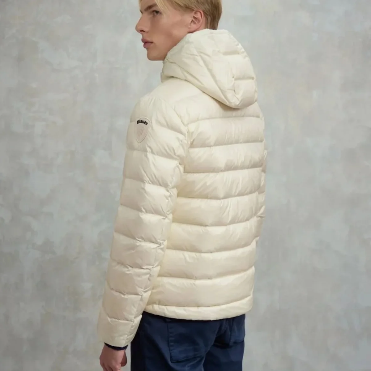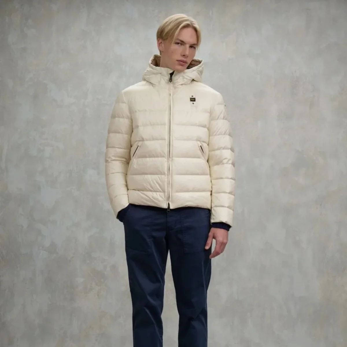 Piumino trapuntato a righe orizzontali. Capo iconico Blauer con imbottitura naturale in piuma, calda e non ingombrante; dedicato a chi vuole essere sempre alla moda in ogni occasione.