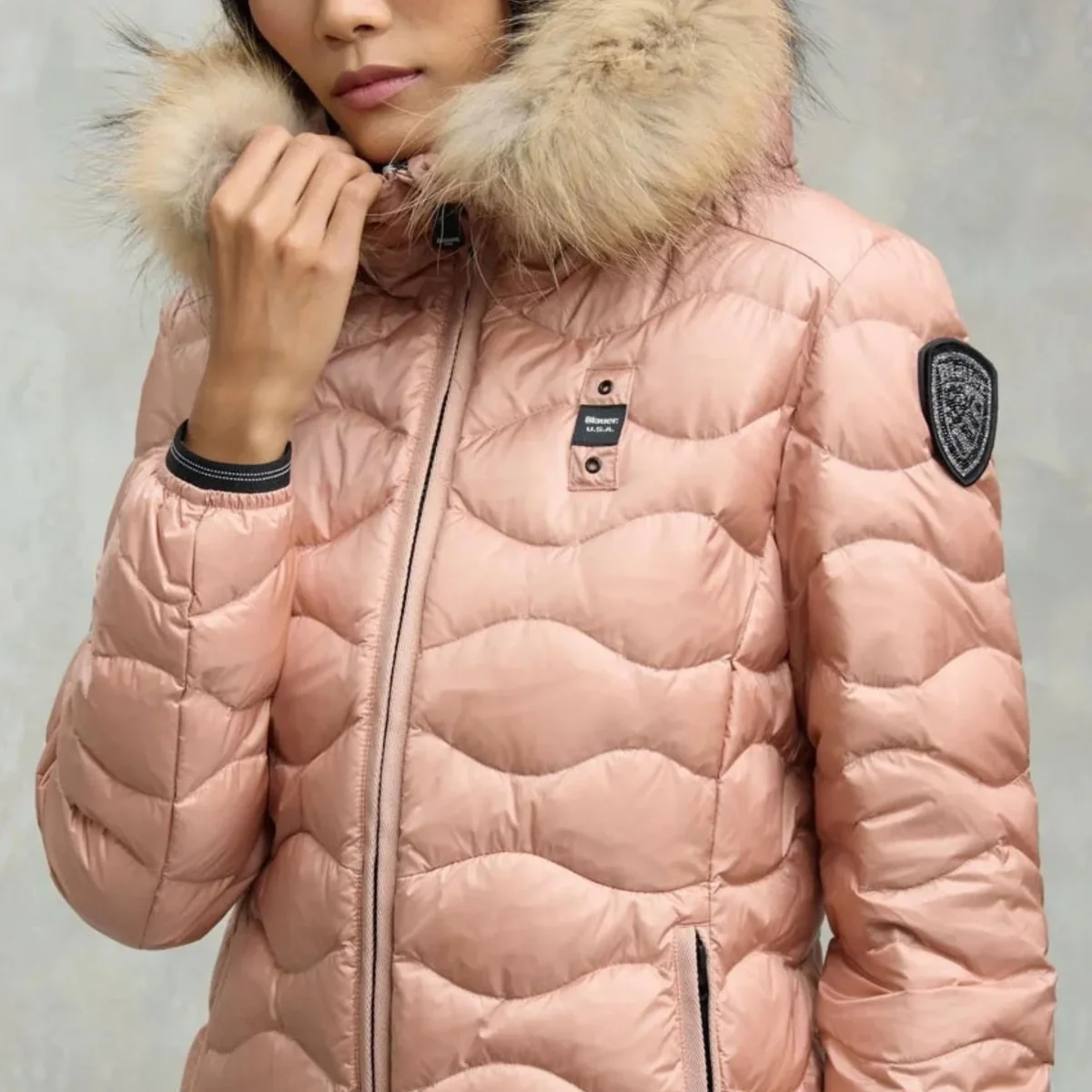 Piumino idrorepellente trapuntato ad onde orizzontali e con profilo del cappuccio in vera piuma. Capo iconico Blauer con imbottitura naturale, calda e non ingombrante, per essere sempre alla moda.