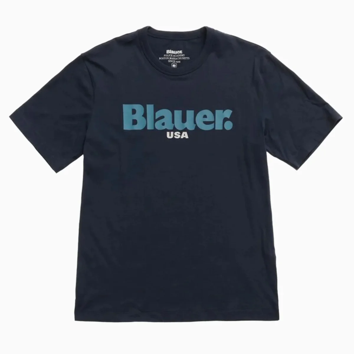 T-shirt uomo a manica corta in jersey di cotone. Girocollo a costina in tono. Stampa sul davanti nel petto con la scritta Blauer USA in contrasto colore. Regular fit.