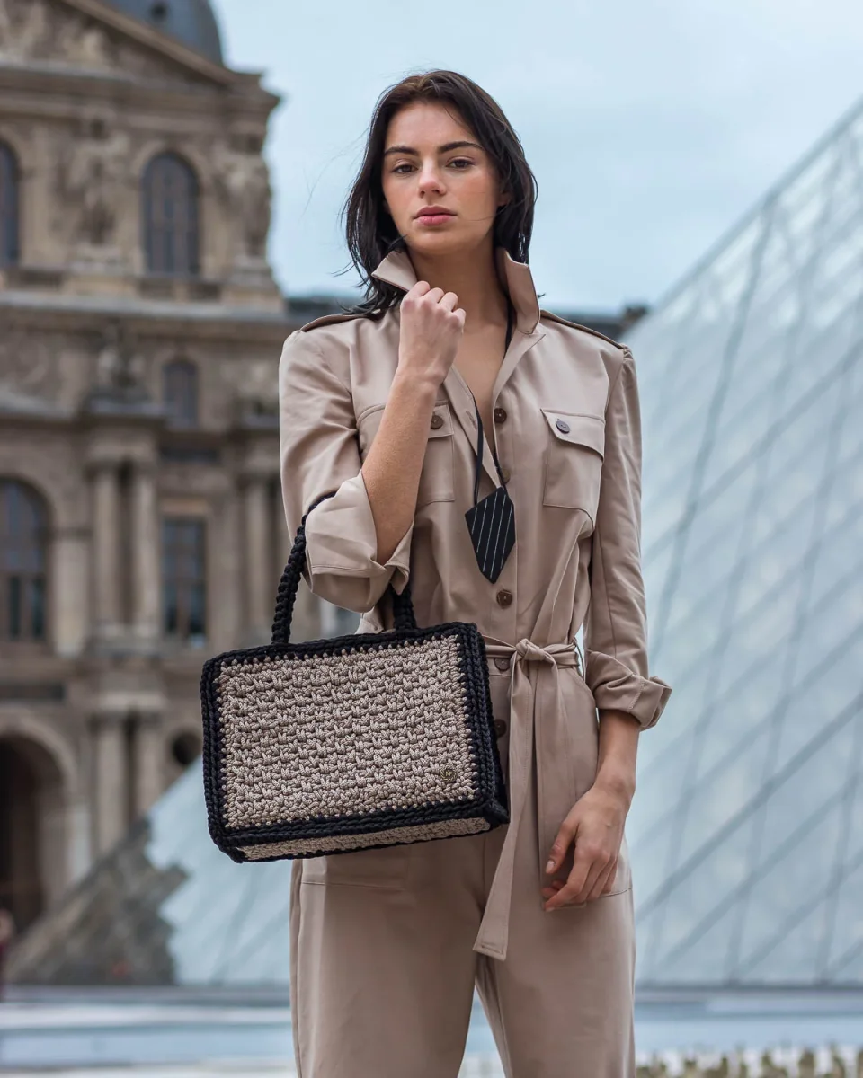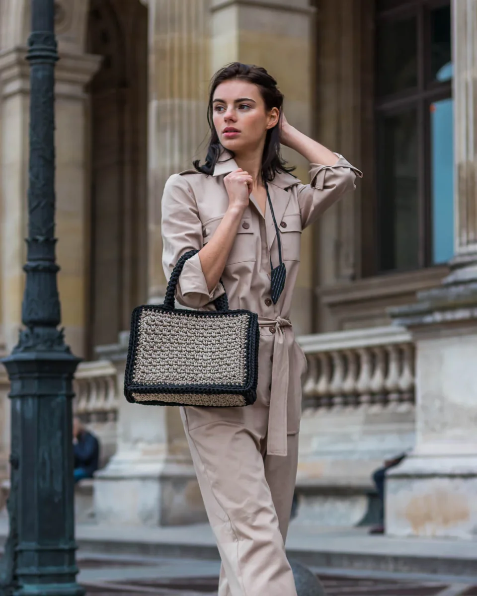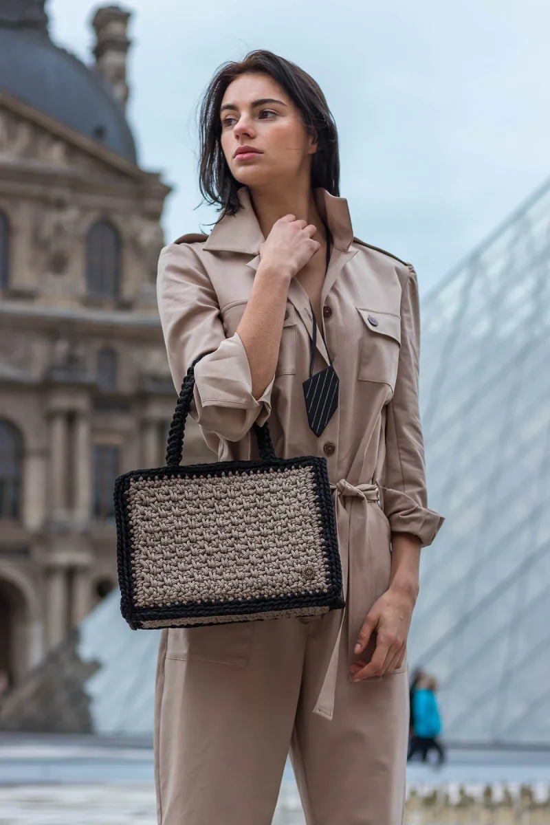 La borsa a spalla Amelie è realizzata artigianalmente con filati di alta qualità, lo spazioso design a forma rettangolare è caratterizzato da una bellissima combinazione di colori contrastanti, color sabbia beige e per la rifinitura dei lati è stato scelto il nero. La borsa a uncinetto ha un interno foderato con tessuto a fantasia, ed è completata da manici di alta qualità lavorati all’uncinetto. Abbina questa pratica borsa piccola ed elegante ai tuoi sandali preferiti per un perfetto look estivo. A causa della natura artigianale del prodotto, nessun altra borsa può essere identica a quello che possiedi e possono verificarsi piccole variazioni nelle dimensioni.