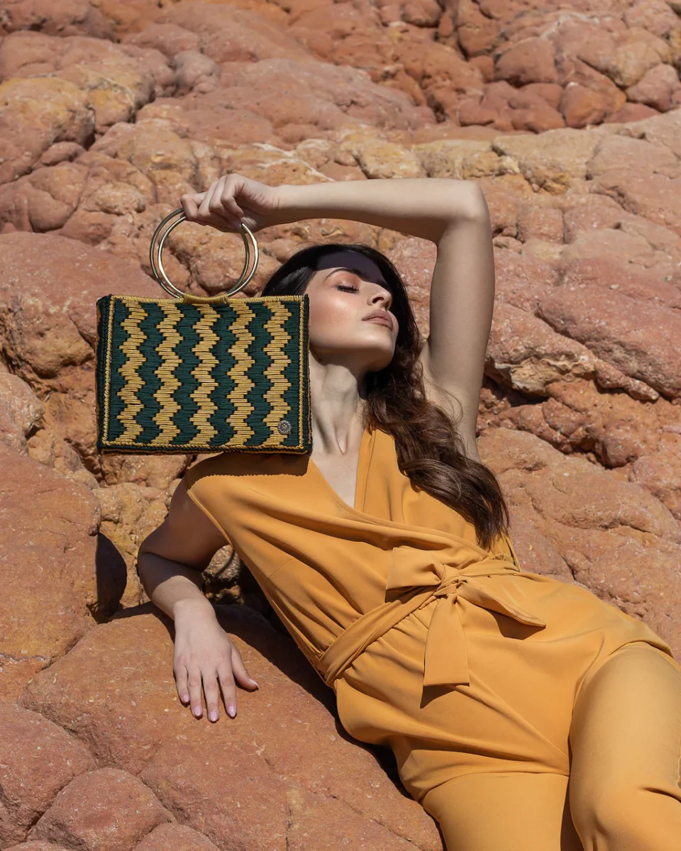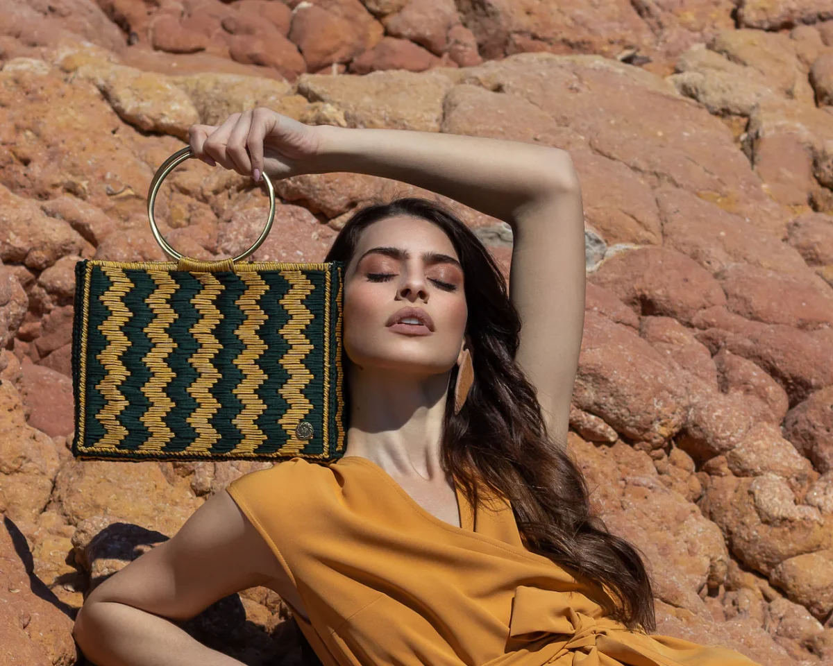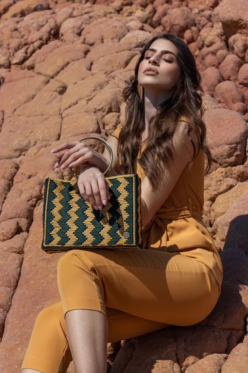 Con la borsa a mano uncinetto Nerissa promettiamo di aggiungere un pezzo di grande carisma al tuo repertorio di accessori. Scegli questa borsa tote bicolore per portare un tocco di fascino artigianale 100% fatto a mano in Grecia, nel tuo repertorio di borse estive. È realizzata in filati all’uncinetto di alta qualità , si caratterizza da una silhouette geometrica con manici metallici ad anello color bronzo. La combinazione di colori è audace come il motivo a zig zag alternato in giallo brillante e verde pino. Possiede una chiusura magnetica e un interno foderato. A causa della natura artigianale del prodotto, nessun altra borsa può essere identica a quello che possiedi e possono verificarsi piccole variazioni nelle dimensioni.