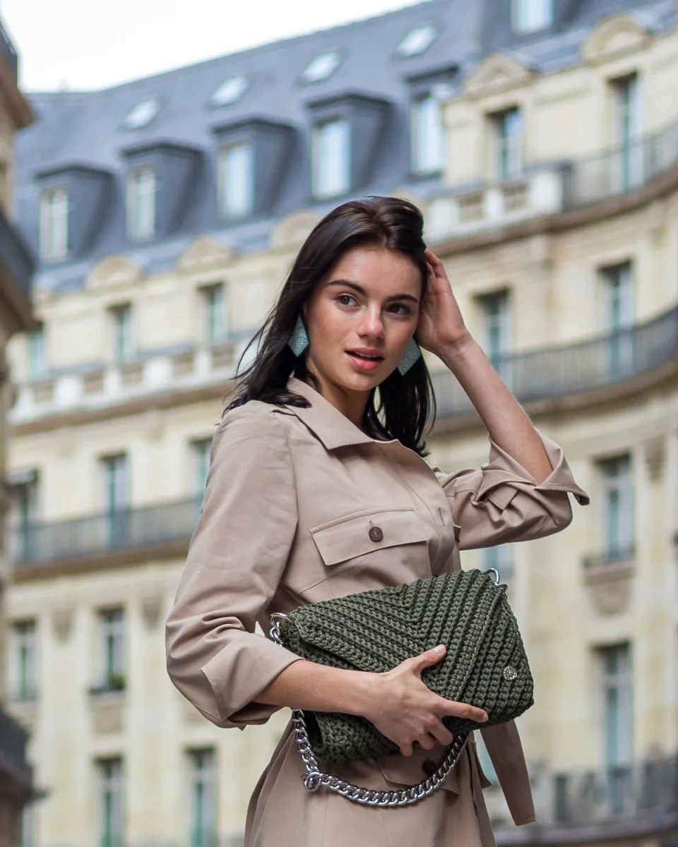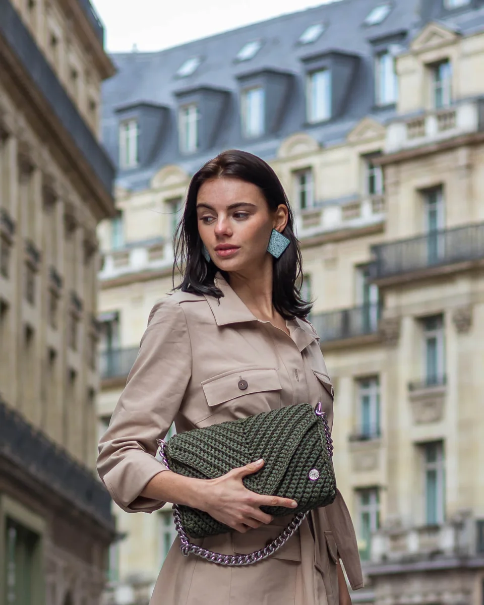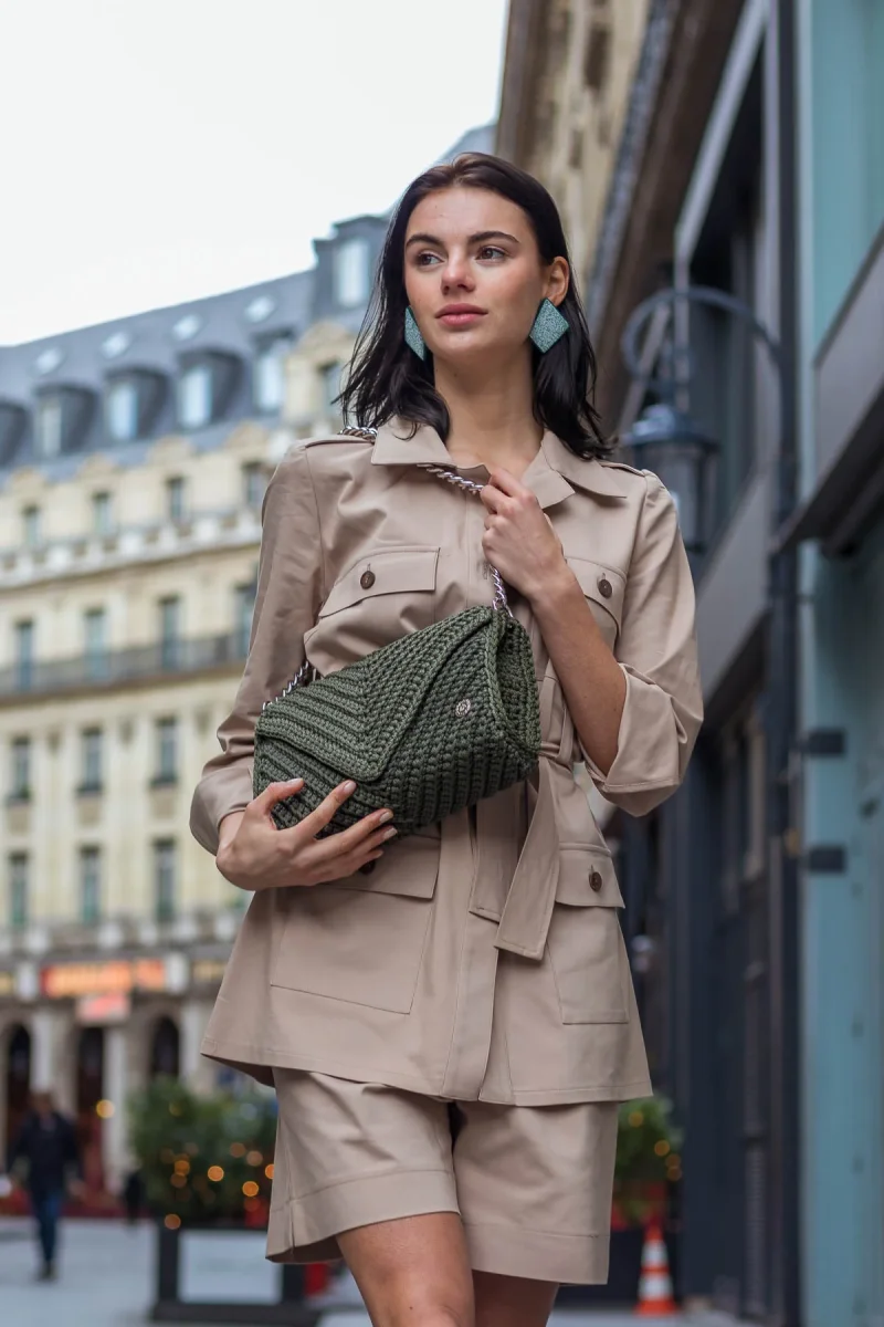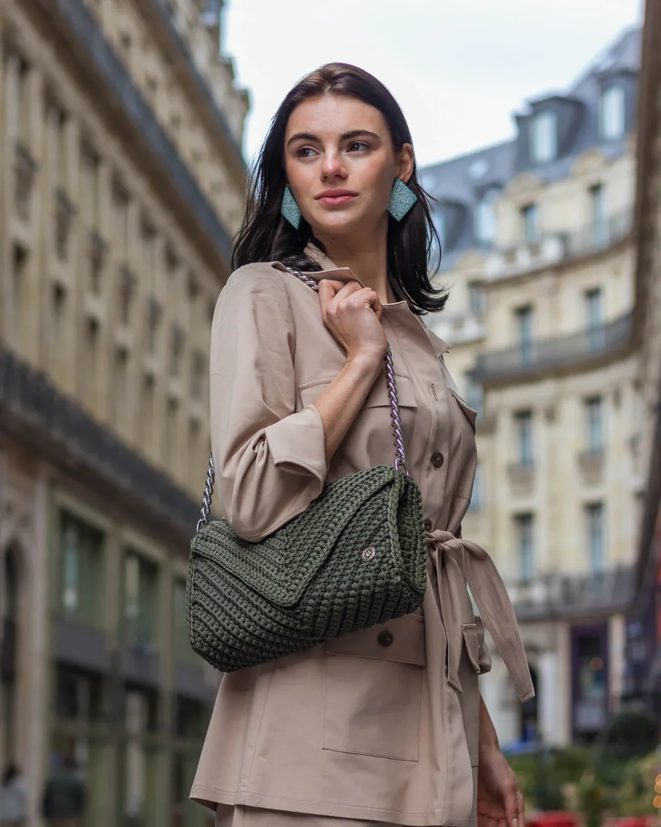 Elegante e sofisticata, la borsa a tracolla Josephine si rivelerà una tua inseparabile compagna di tutti i giorni. Il design della borsa è totalmente nuovo e versatile con il disegno dell’intreccio a uncinetto a forma di “V”. Questa borsa uncinetto elegante è stata realizzata a mano in Grecia con filati di alta qualità in questo bellissimo colore verde oliva e presenta un cinturino a catena metallico argentato. Indossa la tua borsa a spalla Josephine per uno stile casual super moderno e alla moda in questa stagione. A causa della natura artigianale del prodotto, nessun altra borsa può essere identica a quella che possiedi e possono verificarsi piccole variazioni nelle dimensioni.