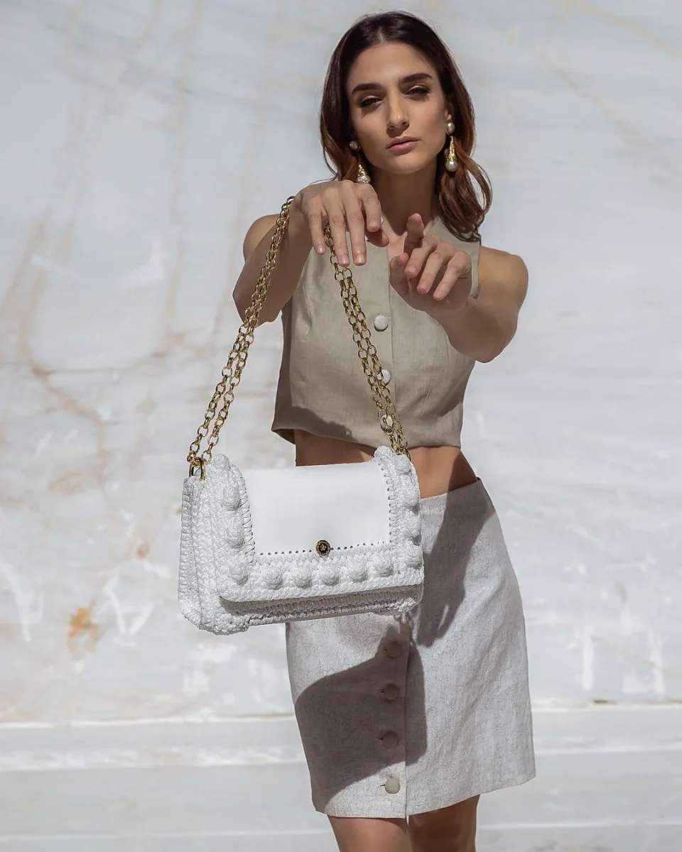 La borsa a tracolla Lydia è uno dei nostri bestseller, apprezzata per il suo design classico ma intrigante. Una nuova variante bianca è stata aggiunta per aggiungere un tassello alla scelta di borse da giorno. Questo capo intramontabile è realizzato 100% a mano con la migliore pelle di vitello ed è decorato con un intreccio a uncinetto. La qualità impeccabile di questa borsa in pelle bianca e maglia a uncinetto, la renderà un pezzo evergreen del tuo guardaroba, una borsa fatta a mano e unica, che porterai stagione dopo stagione. Lo stile frizzante e sbarazzino all’uncinetto che contorna la parte in pelle, conserva un design elegante e sofisticato insieme alla catenella color oro brillante. A causa della natura artigianale del prodotto, nessun’altra borsa può essere identica a quella che possiedi e possono verificarsi piccole variazioni nelle dimensioni.