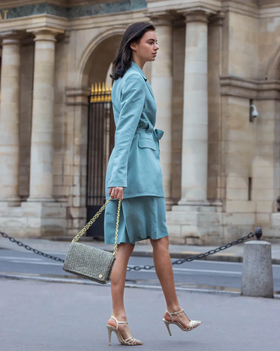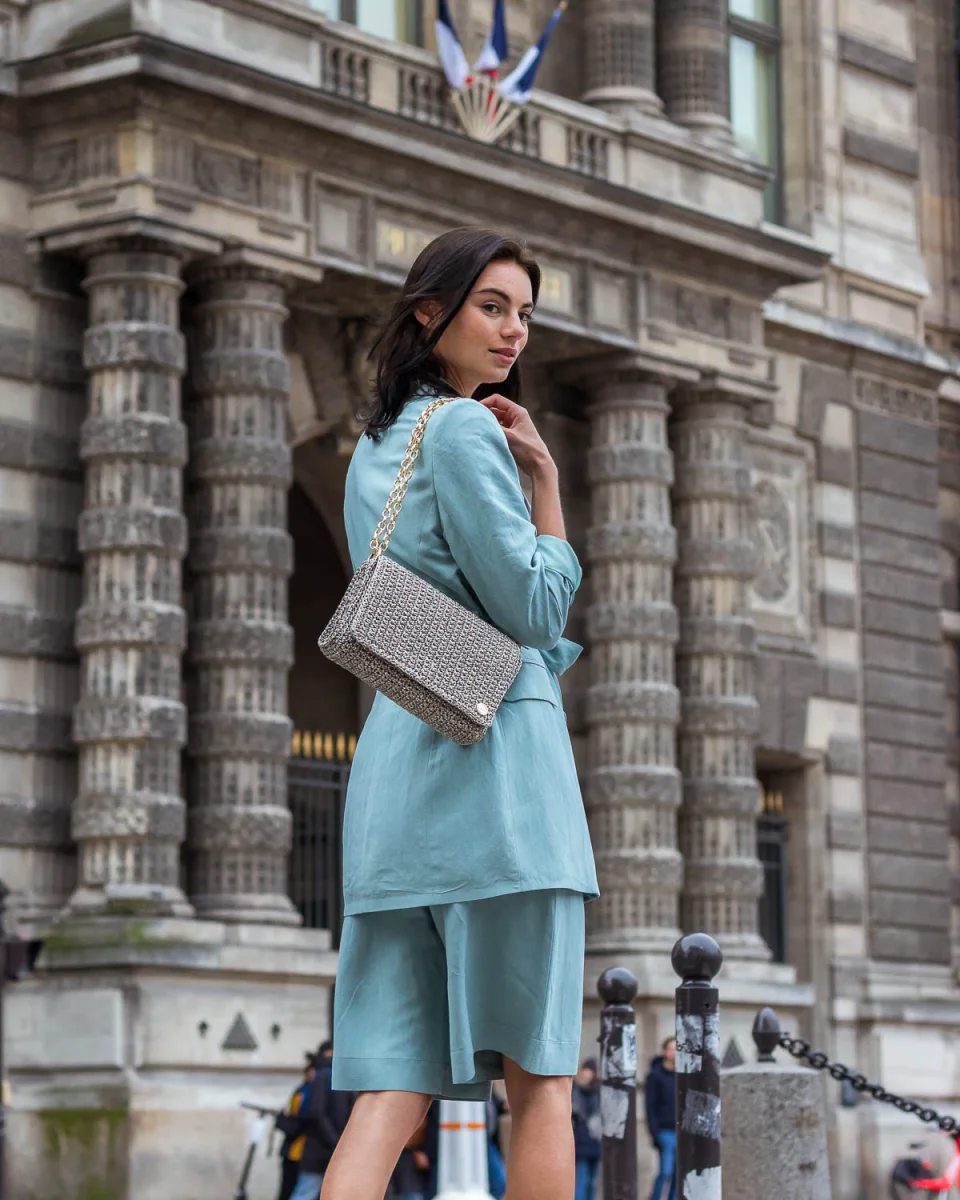 La borsa a spalla Odette viene proposta in un’esclusiva tonalità grigio-argento con scintillanti dettagli dorati. La sua silhouette strutturata è stata realizzata artigianalmente in Grecia con un intreccio a uncinetto. La forma rettangolare si apre con chiusura frontale magnetica e l’interno è foderato con un tessuto fantasia. Indossala abbinandola a eleganti completi o ad un semplice paio di jeans. A causa della natura artigianale del prodotto, nessun altra borsa può essere identica a quella che possiedi e possono verificarsi piccole variazioni nelle dimensioni.