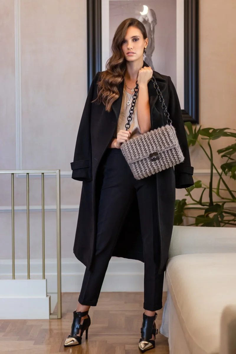 La borsa di lana uncinetto Virgil è una borsa da donna a spalla espressione di maestria artigianale. Realizzata in morbido filato di lana merino la borsa ha un’ampia silhouette rettangolare. È realizzato in “extra merino”, un tipo di filato estremamente morbido, elastico e durevole con resistenza naturale ai lavaggi con acqua grazie alla sua sintesi (50% lana e 50% acrilico). Una chiusura con lucchetto in metallo nero di nuova introduzione è il punto focale di questo capolavoro beige scuro, la cui silhouette squadrata è elegantemente rifinita con una catena nera metallizzata. Porta il tuo insieme a completi eleganti per un aspetto quotidiano sorprendente e chic. la sua tonalità blu-marrone-beige è adatta alle stagioni autunno e inverno: indossala con i tuoi abiti più eleganti, dagli abiti leggeri ai maglioni di lana.