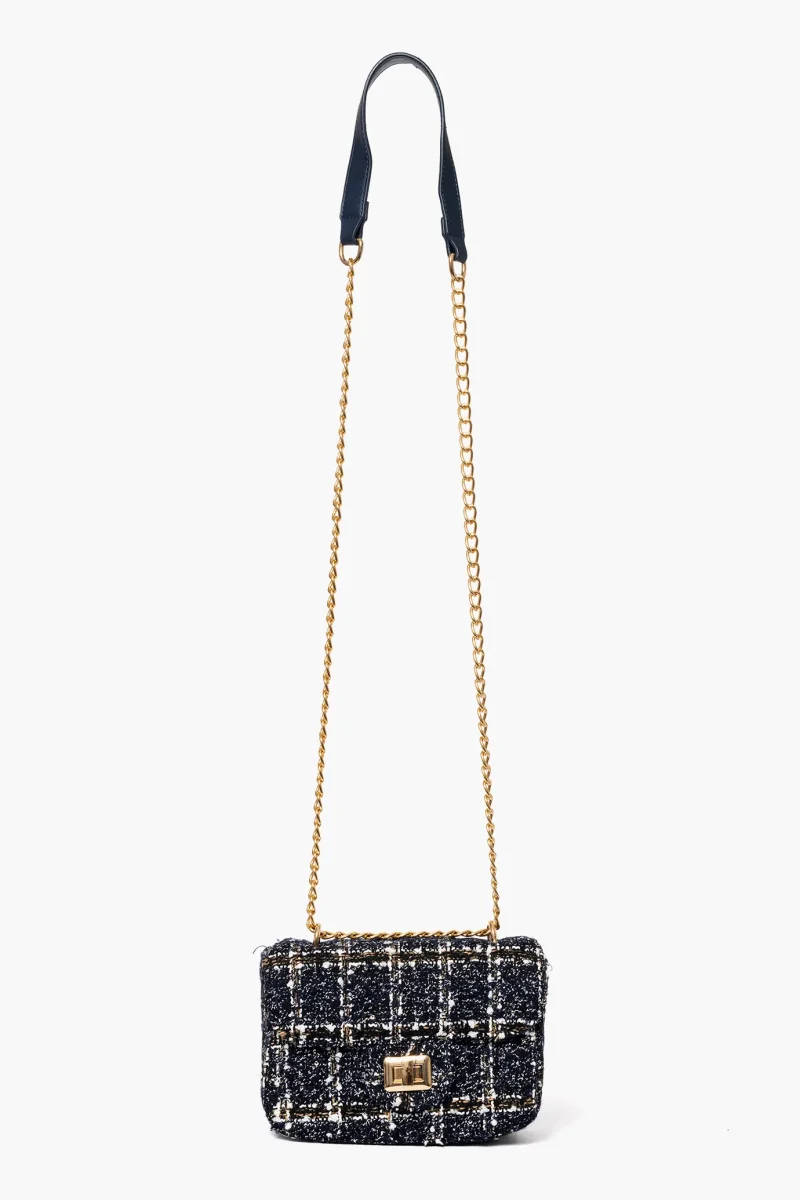 Borsa a tracolla in tessuto a quadri blu bianco beige e nero, con tracolla catenina nel colore oro, pattina con chiusura nel colore oro, minuto di cerniera