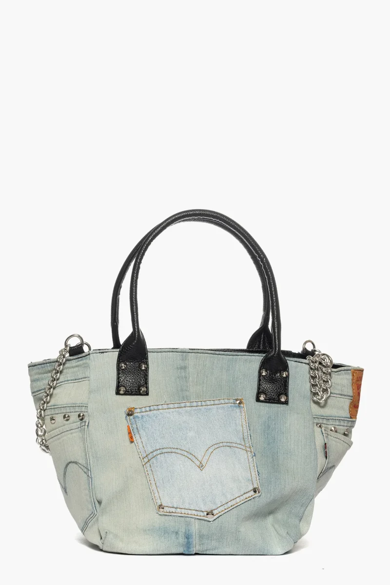 Borsa realizzata con jeans chiaro, con manici in similpelle nera ,tracolla estraibile e regolabile. NOTA BENE, LA COLORAZIONE DEL JEANS POTREBBE CAMBIARE, IN QUANTO VENGONO UTILIZZATI DEI VERI E PROPRI JEANS, PER CUI VARIANO CONTINUAMENTE LE TONALITà , A SOTTOLINEARE L’ARTIGIANALITà DEL PRODOTTO.