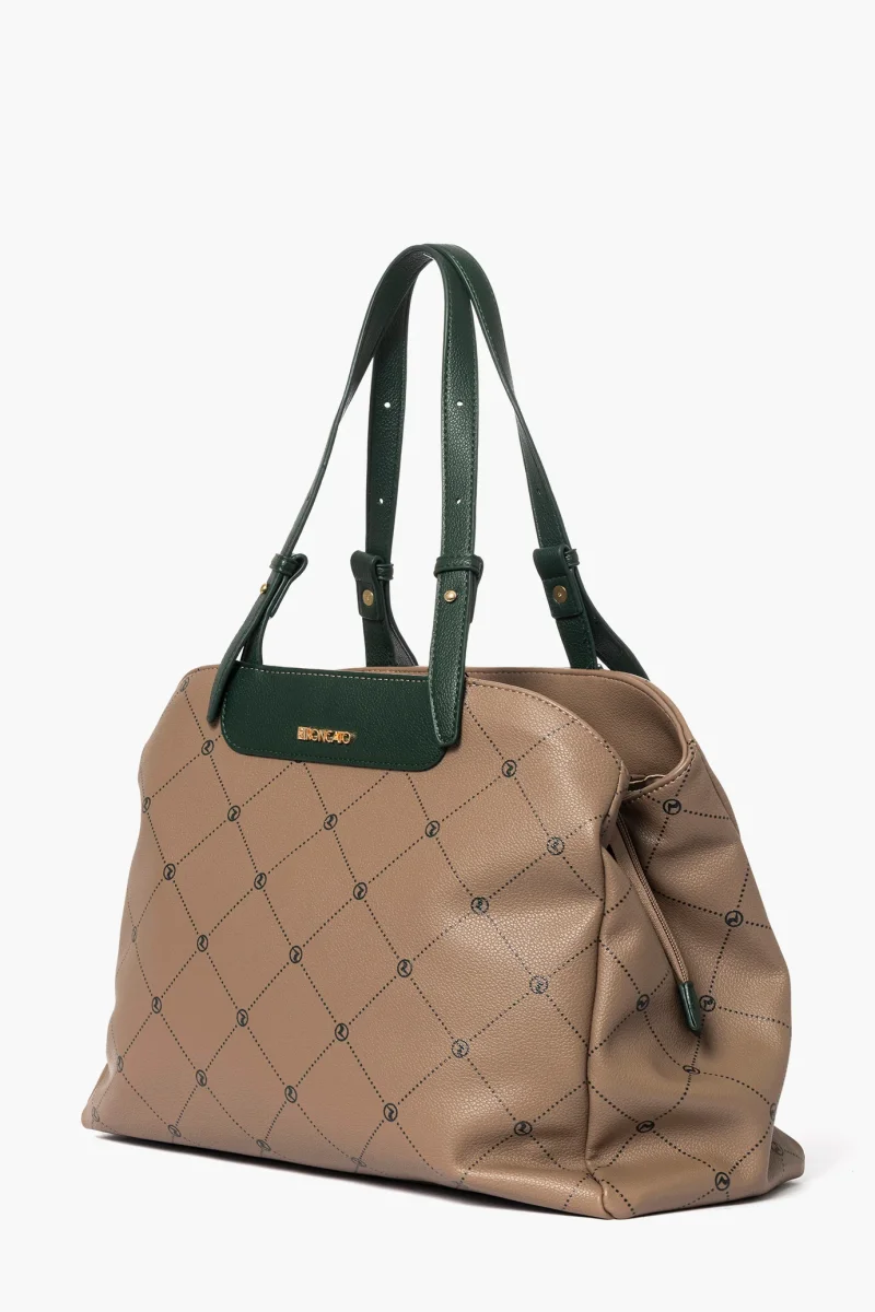 Borsa a spalla dimensione grande, in ecopelle taupè e verde chiusura con cerniera.