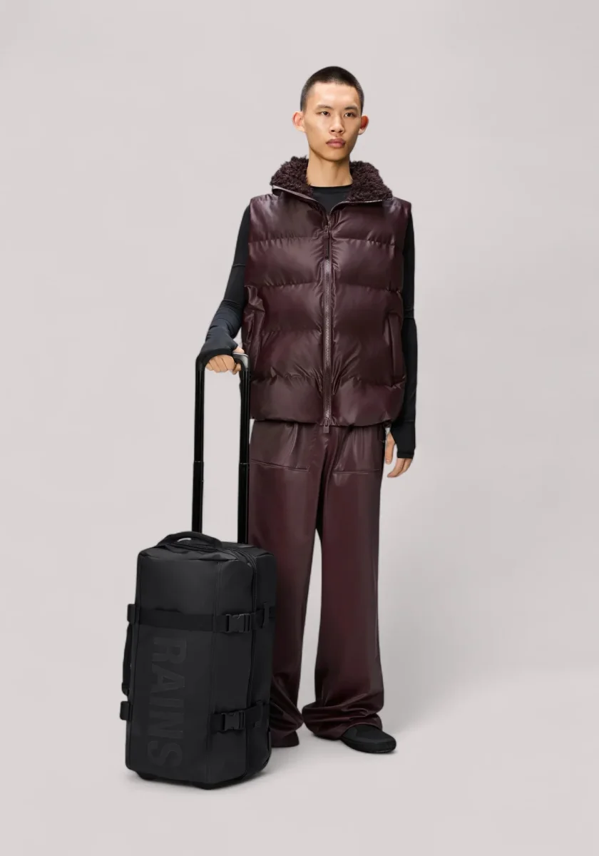 Questo trolley impermeabile combina il PU impermeabile tipico di Rains con un guscio duro a mezza silhouette per maggiore stabilità in piedi e durata.