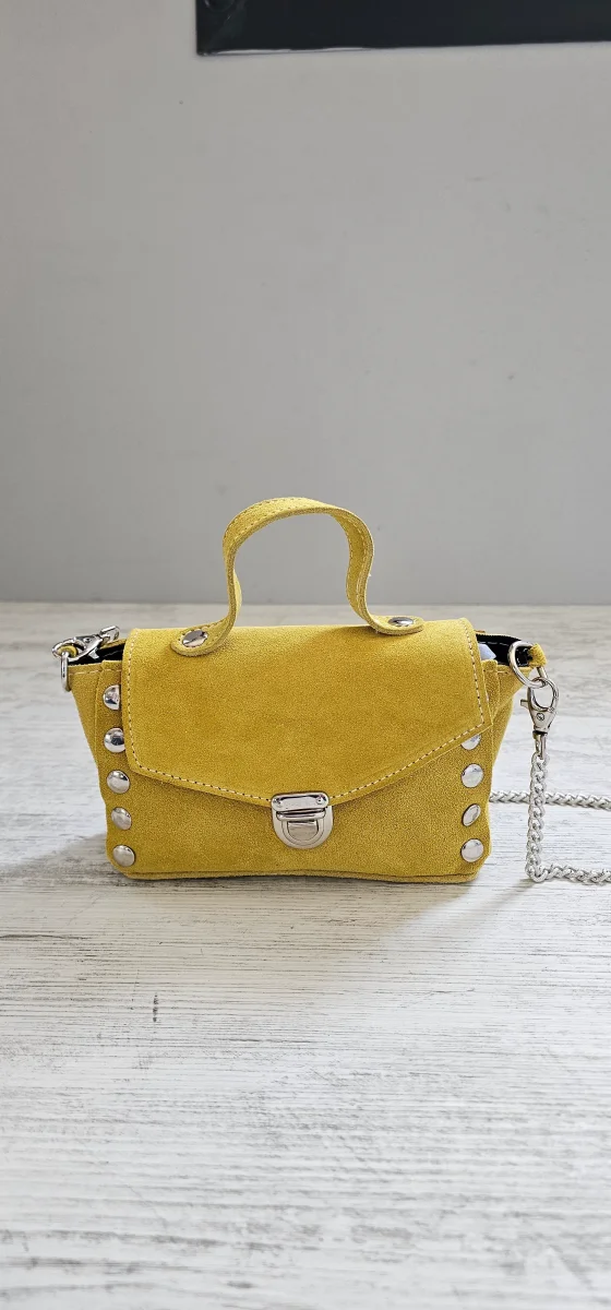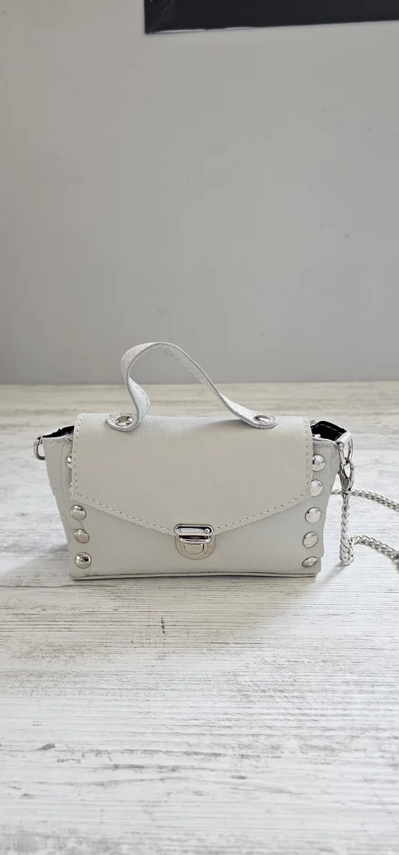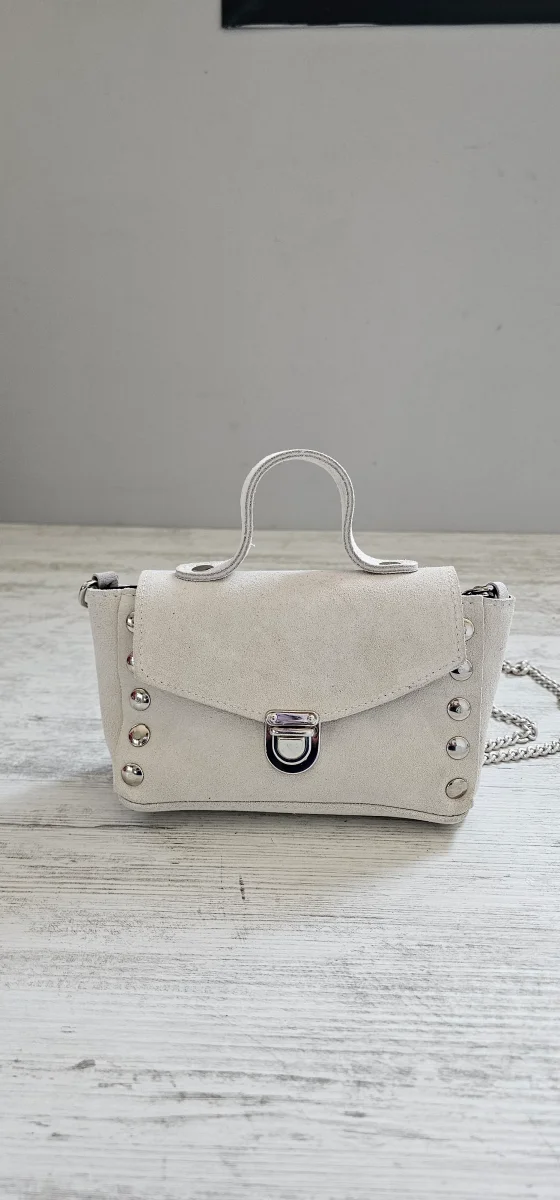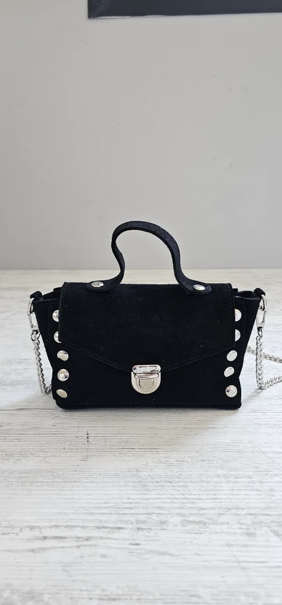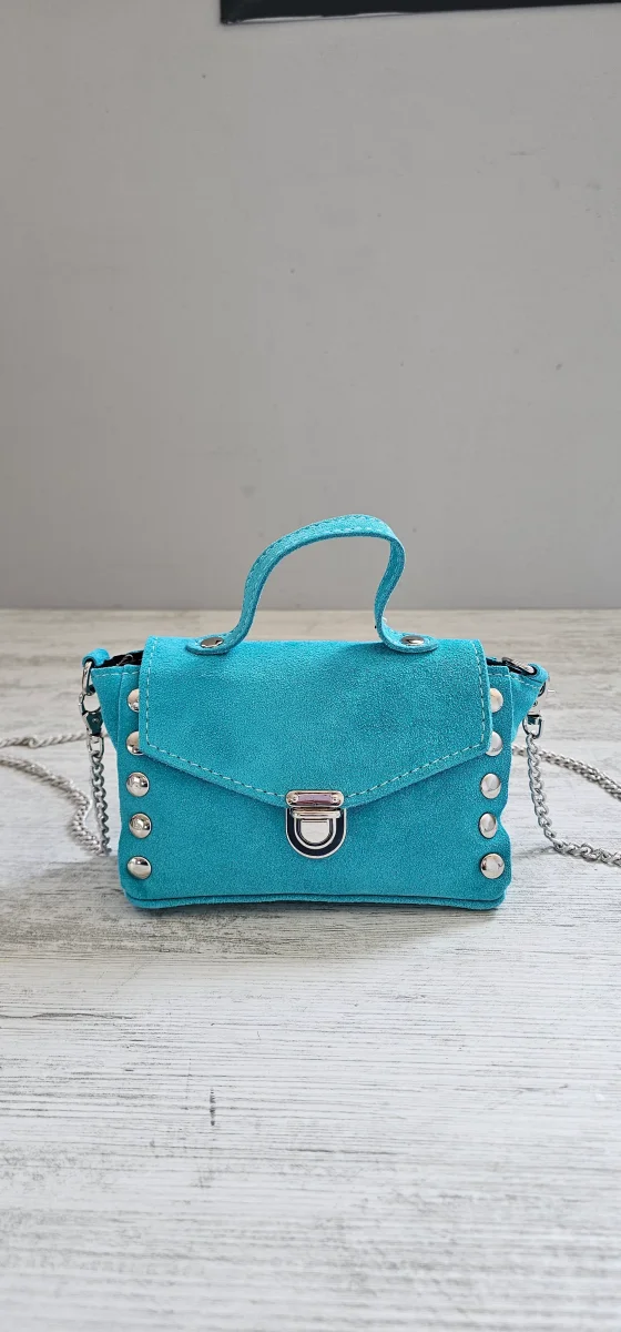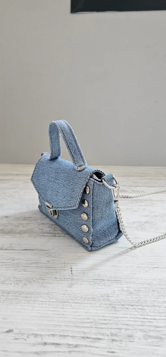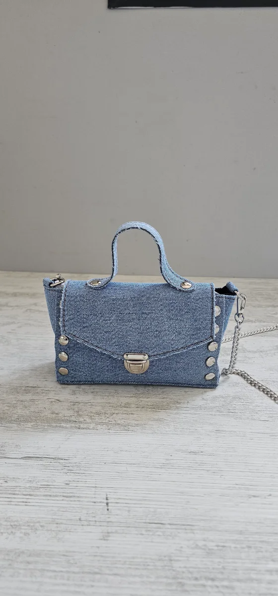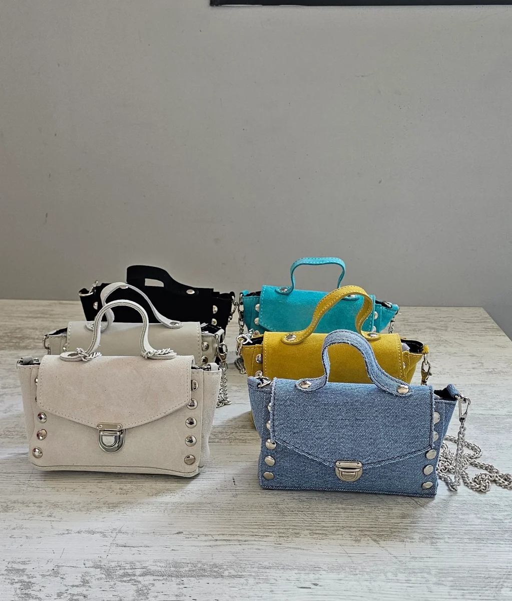 Borsetta mini in camoscio pelle o in denim, foderata e con tracolla catenina nel colore argento. chiusura incastro e borchie tonde nel colore argento, artigianali, utili per serata in discoteca, essenziale e minimal.