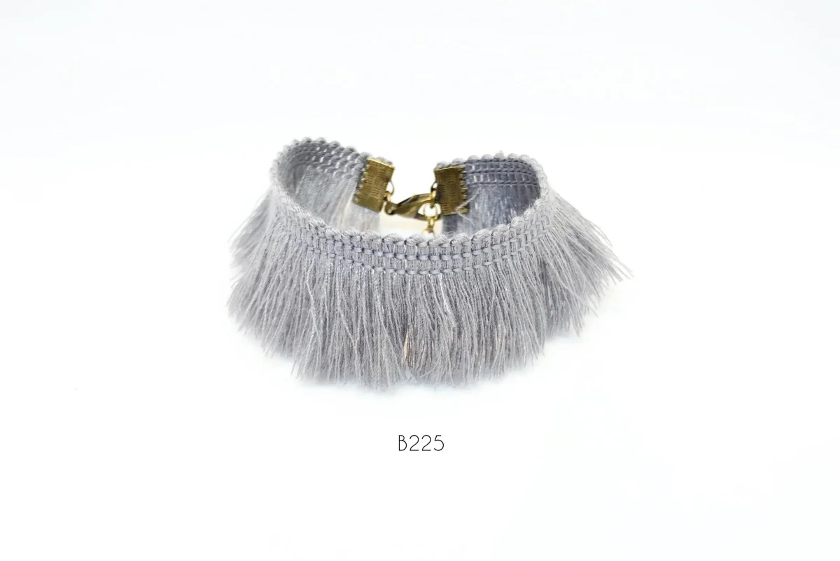 Braccialetto boho con chiusura in bronzo regolabile. Il braccialetto in tessuto Boho 225 è composto da una treccia di tessuto sintetico grigio con frange e chiusura regolabile in bronzo placcato oro vintage.