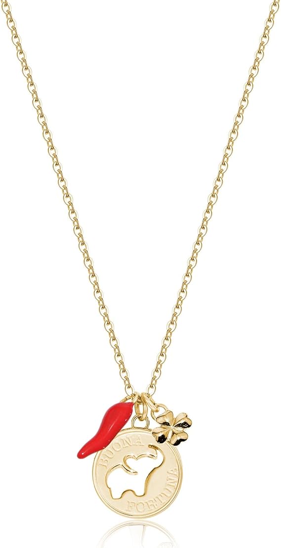 - Collana in acciaio 316L e finitura pvd oro 14K con pendente con elefante, pendente a forma di quadrifoglio e cornetto con smalto rosso. Lunghezza Collana 440mm. Scegli i gioielli Brosway ed esprimi il tuo stile e la tua personalità in tutte le occasioni