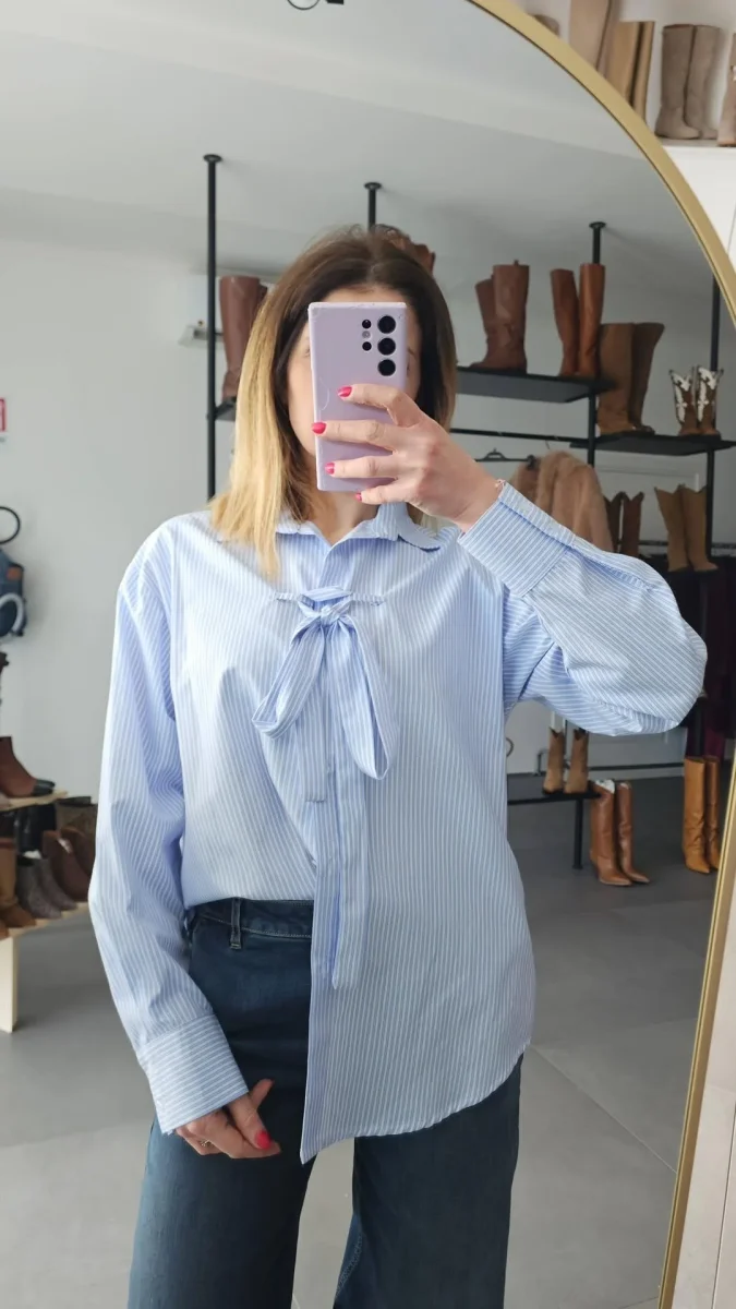 Camicia marchio le streghe di cotone, taglio over, con fiocco, a righe bianco azzurro