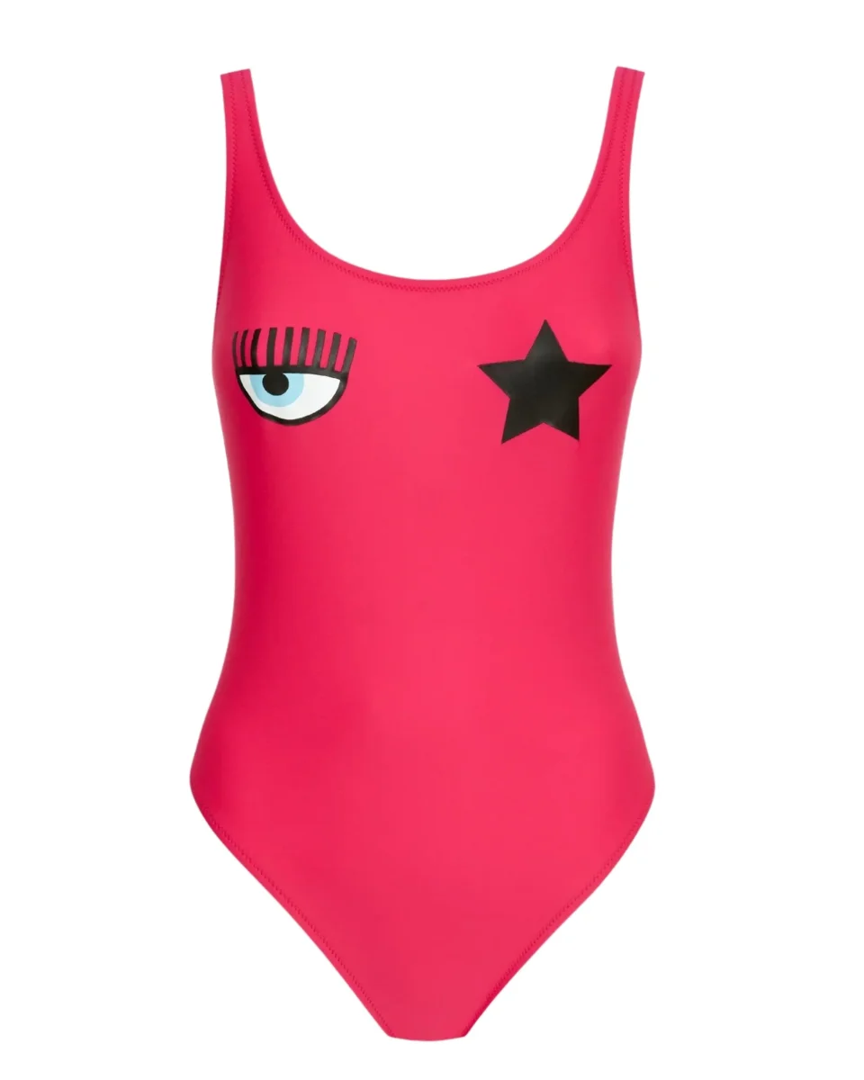 Costume da bagno intero per donna by Chiara Ferragni, caratterizzato da uno scollo profondo sul retro e dalla stampa con pattern Eye-Star, tipico del brand, sul fronte.
