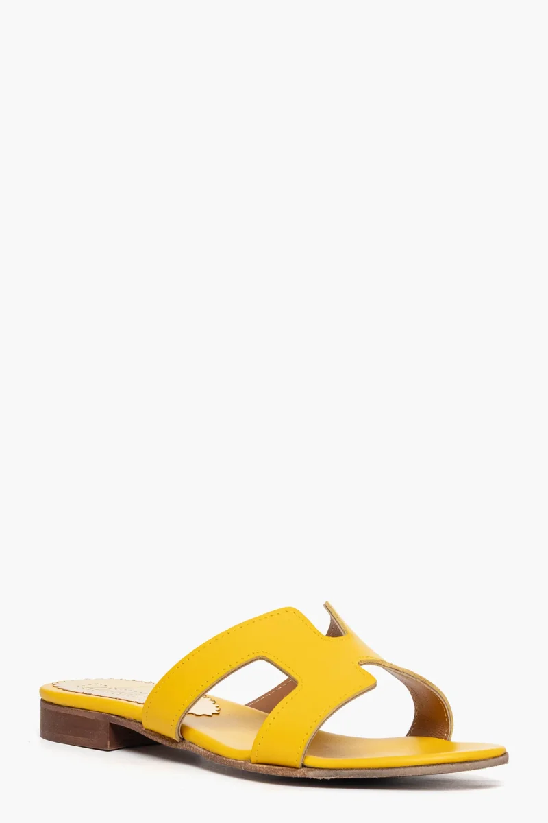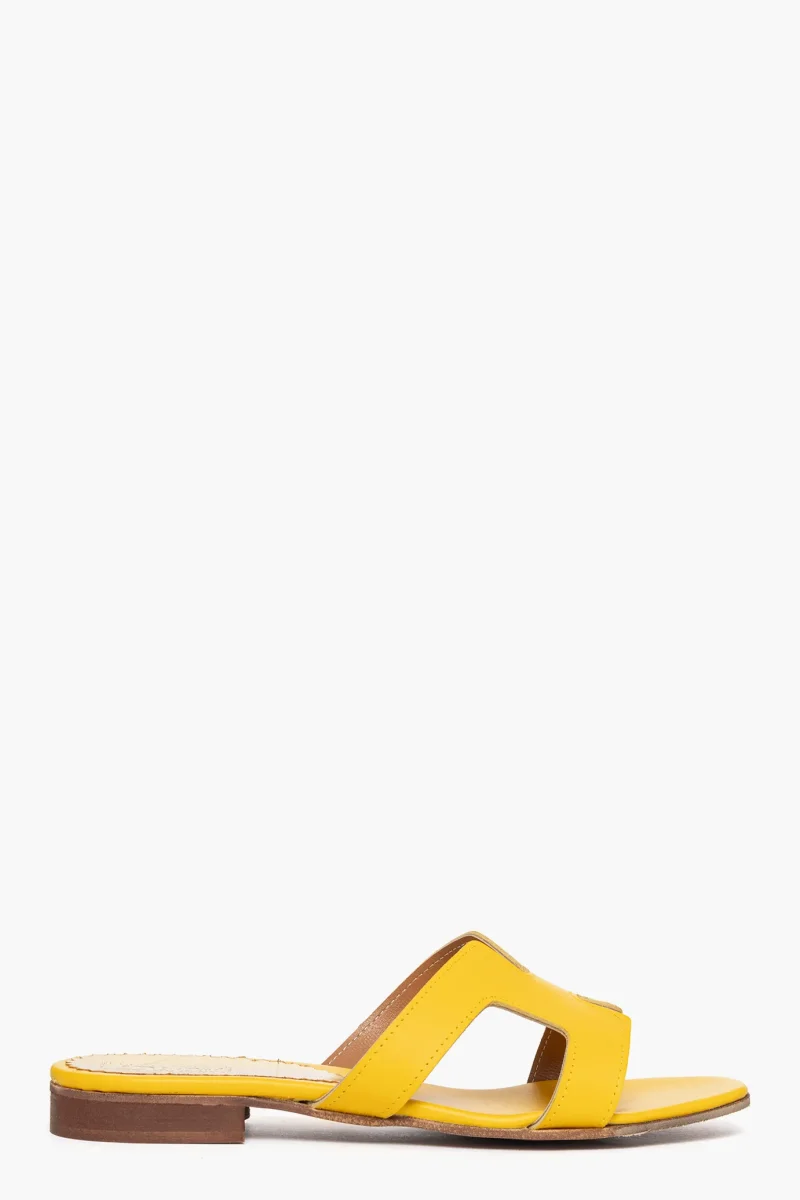 Ciabatte Amalfi in pelle giallo, sottopiede in pelle giallo, altezza 1-2 cm. Calzano regolari, taglia italiana. Calzature realizzate artigianalmente, rigorosamente made in Italy.