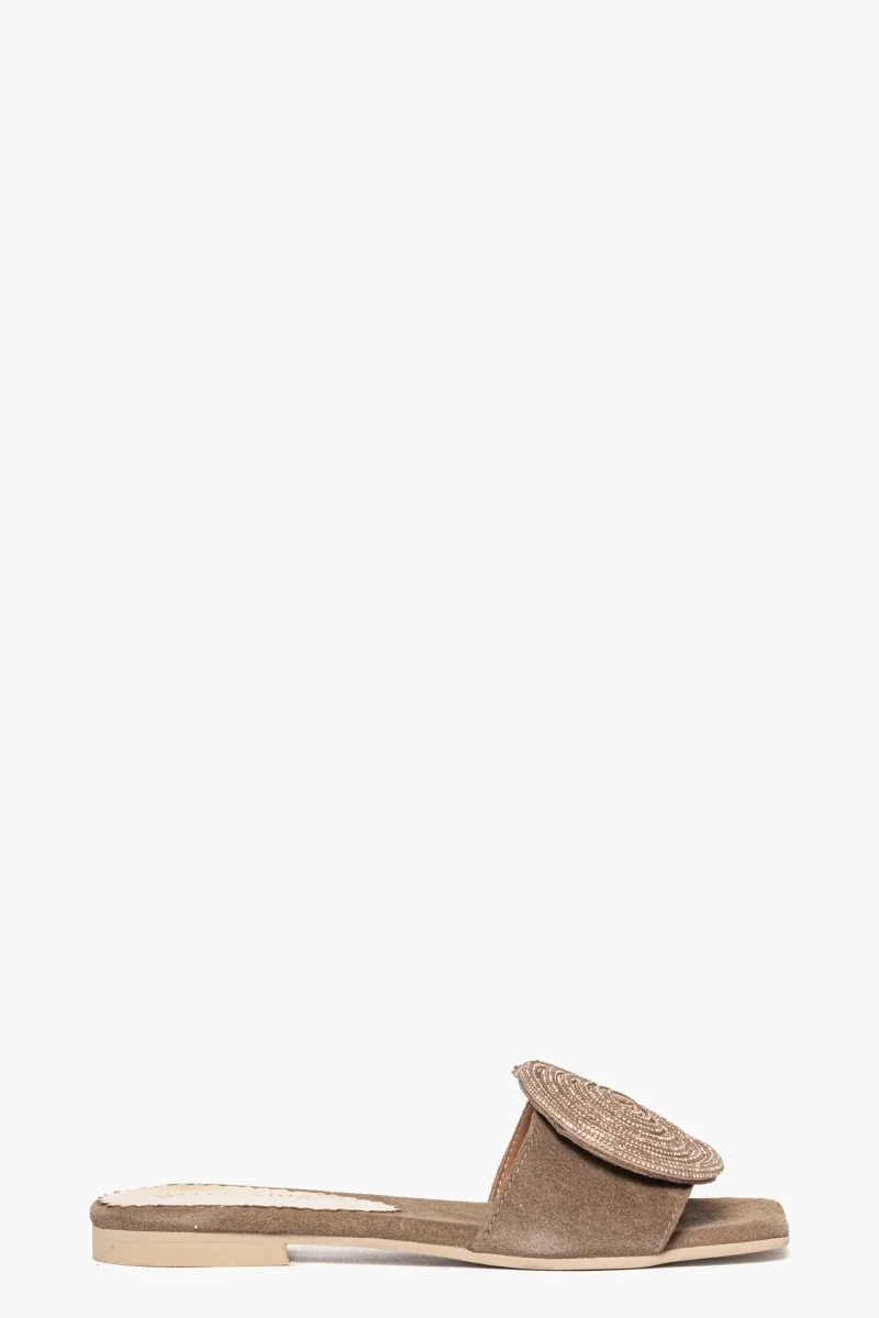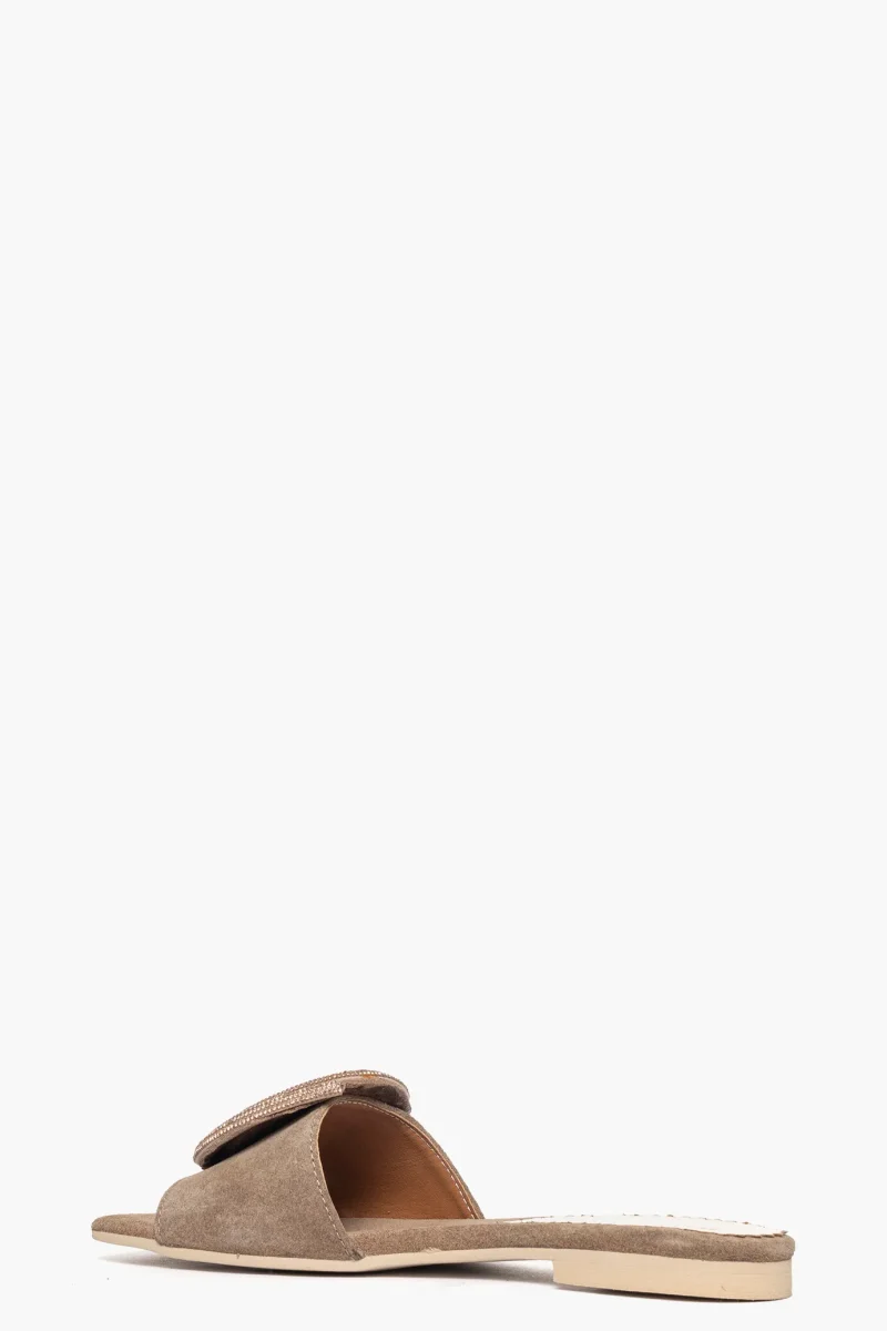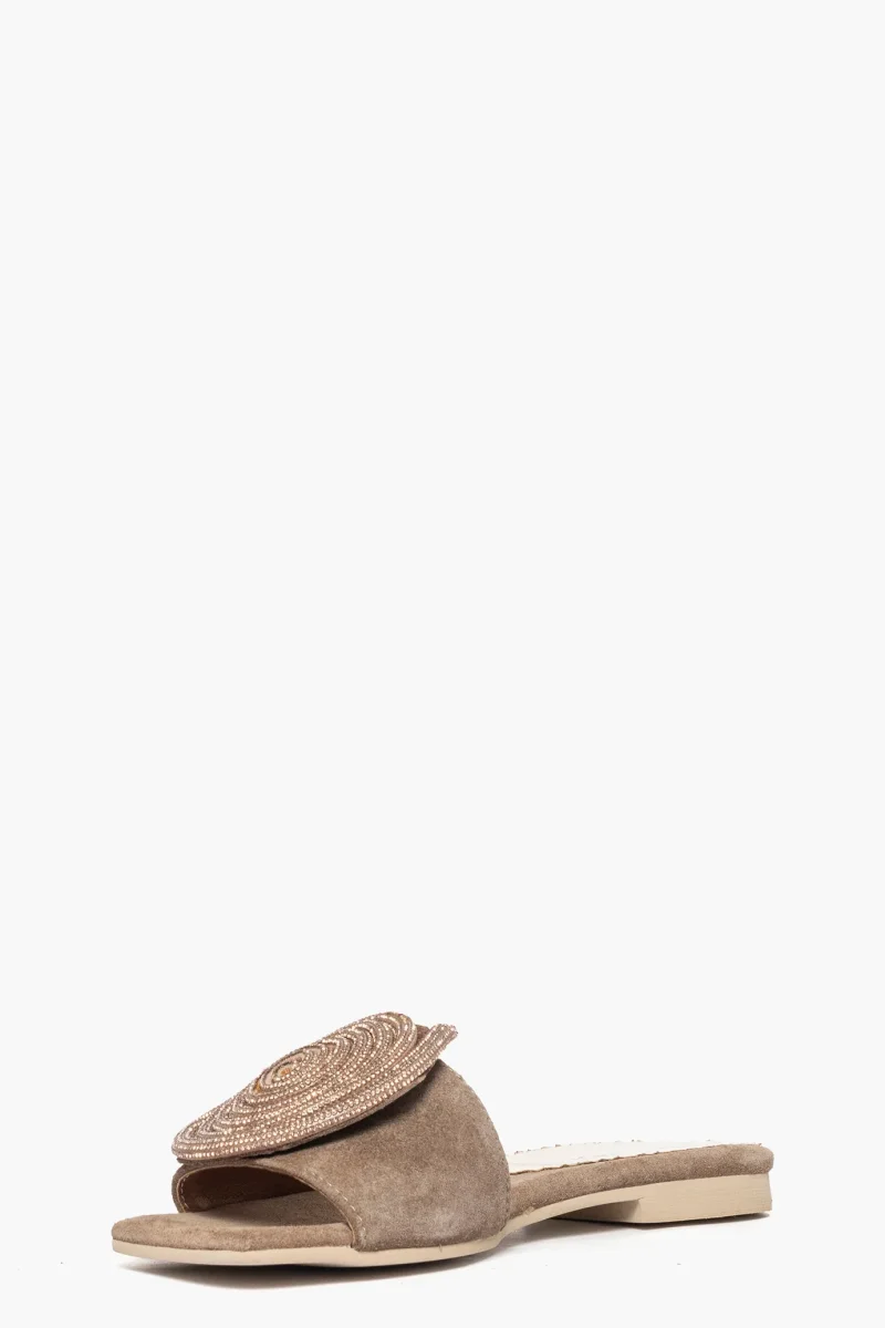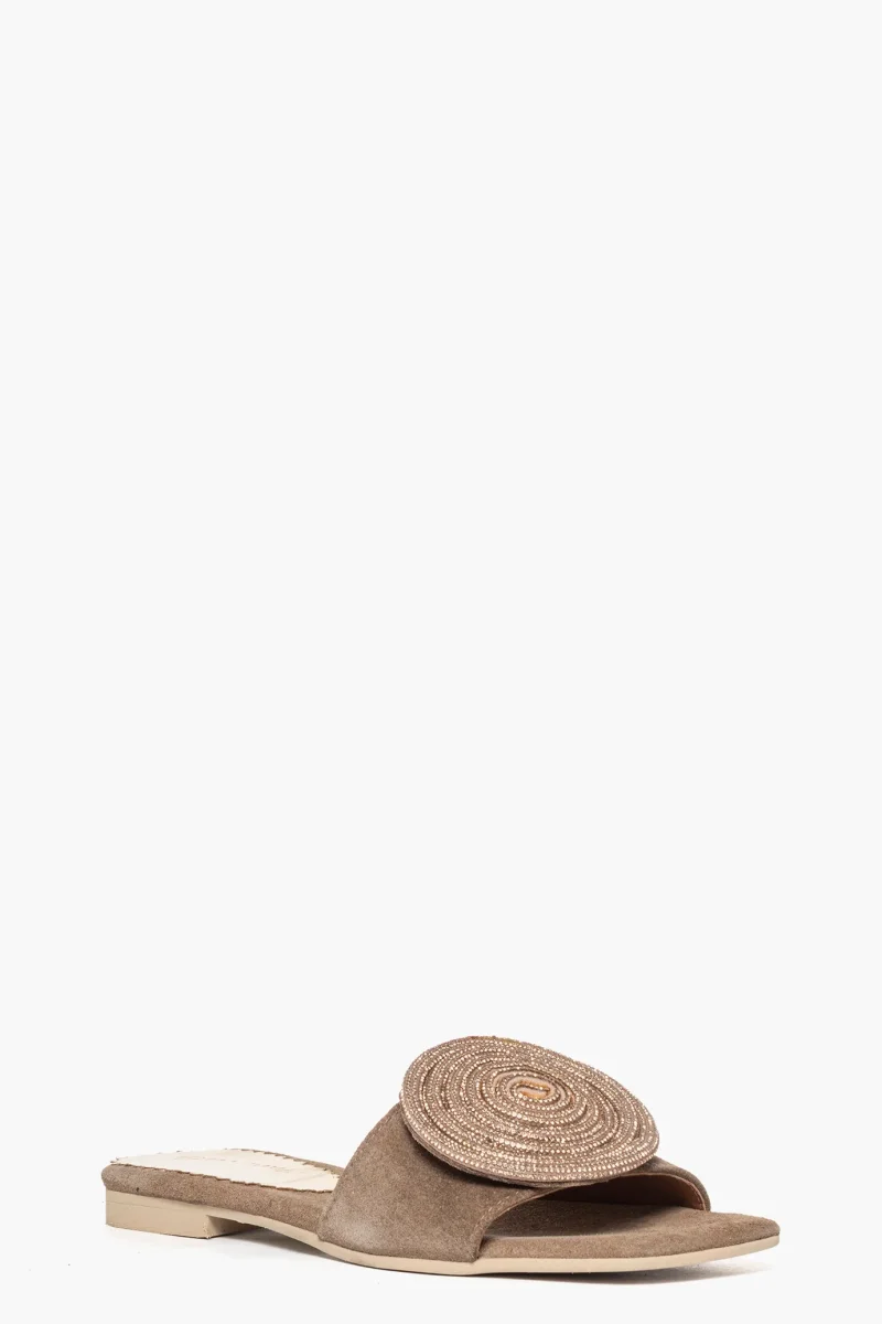 Ciabatte Ludovica in camoscio taupè, con girella di strass nel colore in tinta, suola in tunit altezza 3. Calzature realizzate in modo artigianale, rigorosamente Made in Italy.