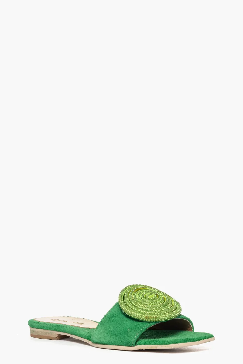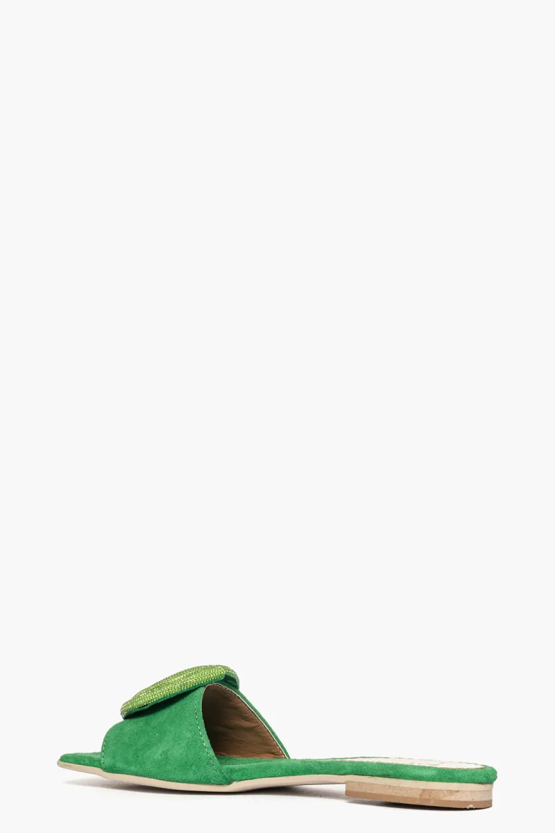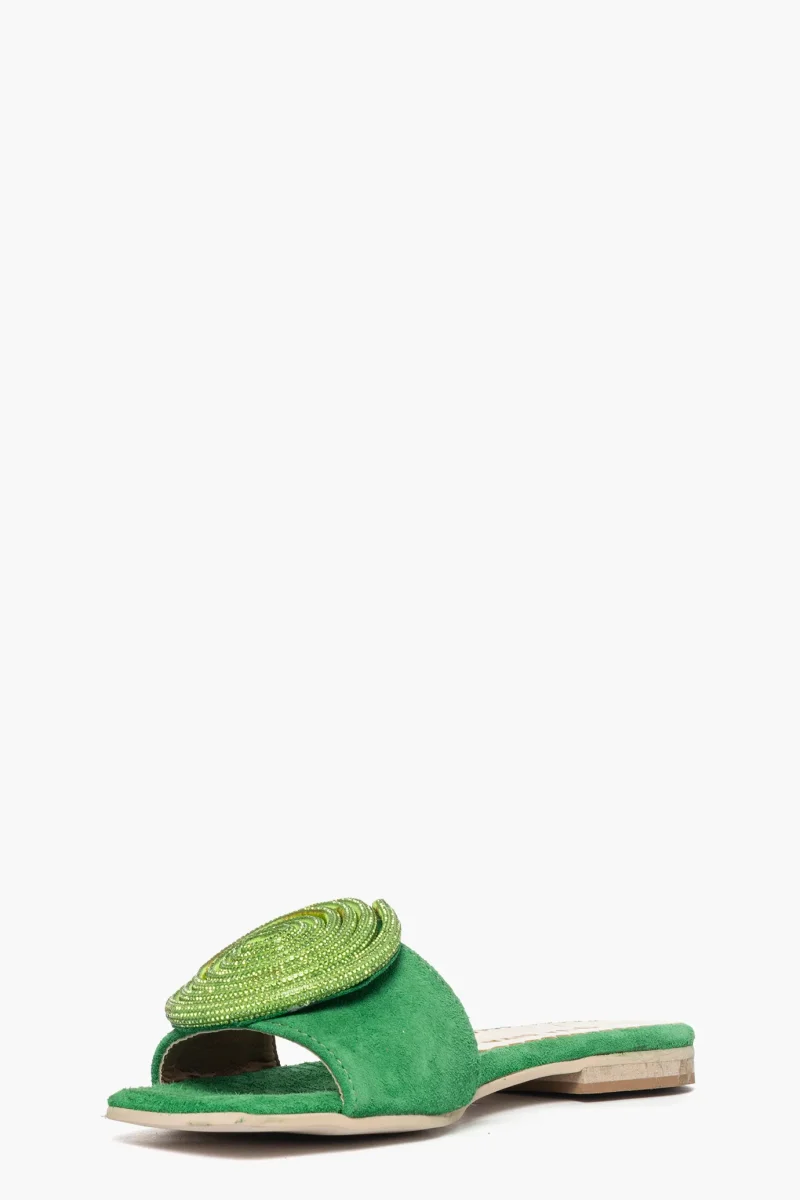 Ciabatte Ludovica in camoscio verde, con girella di strass nel colore in tinta, suola in tunit altezza 3. Calzature realizzate in modo artigianale, rigorosamente Made in Italy.