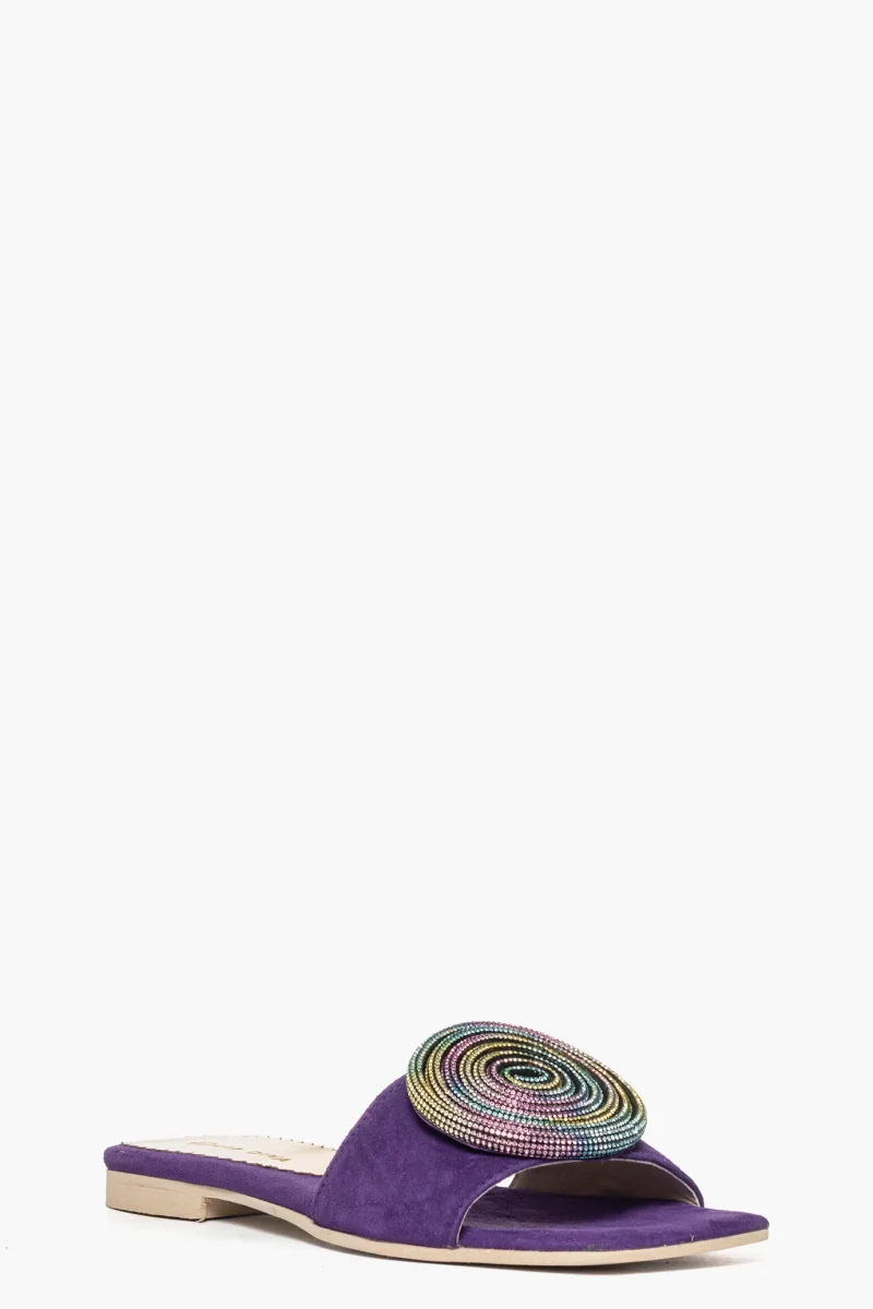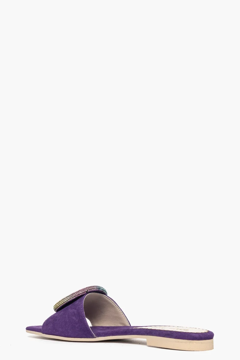 Ciabatte Ludovica in camoscio viola, con girella di strass multicolore, suola in tunit altezza 3. Calzature realizzate in modo artigianale, rigorosamente Made in Italy.