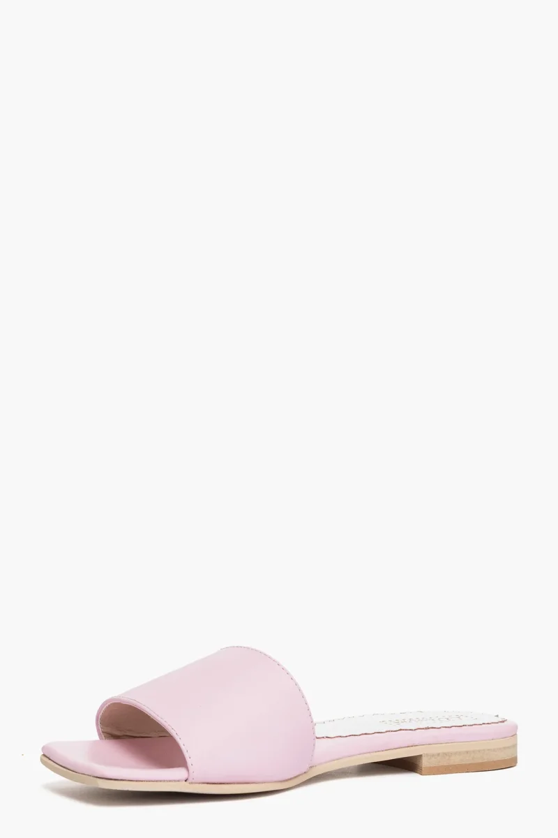Ciabatte in pelle rosa con punta quadra e semplice fascia, interni in similpelle, sottopiede in pelle rosa, suola in thunit neutra, altezza 2 cm. Calzano regolari, taglia italiana. Calzature realizzate artigianalmente, rigorosamente made in Italy.