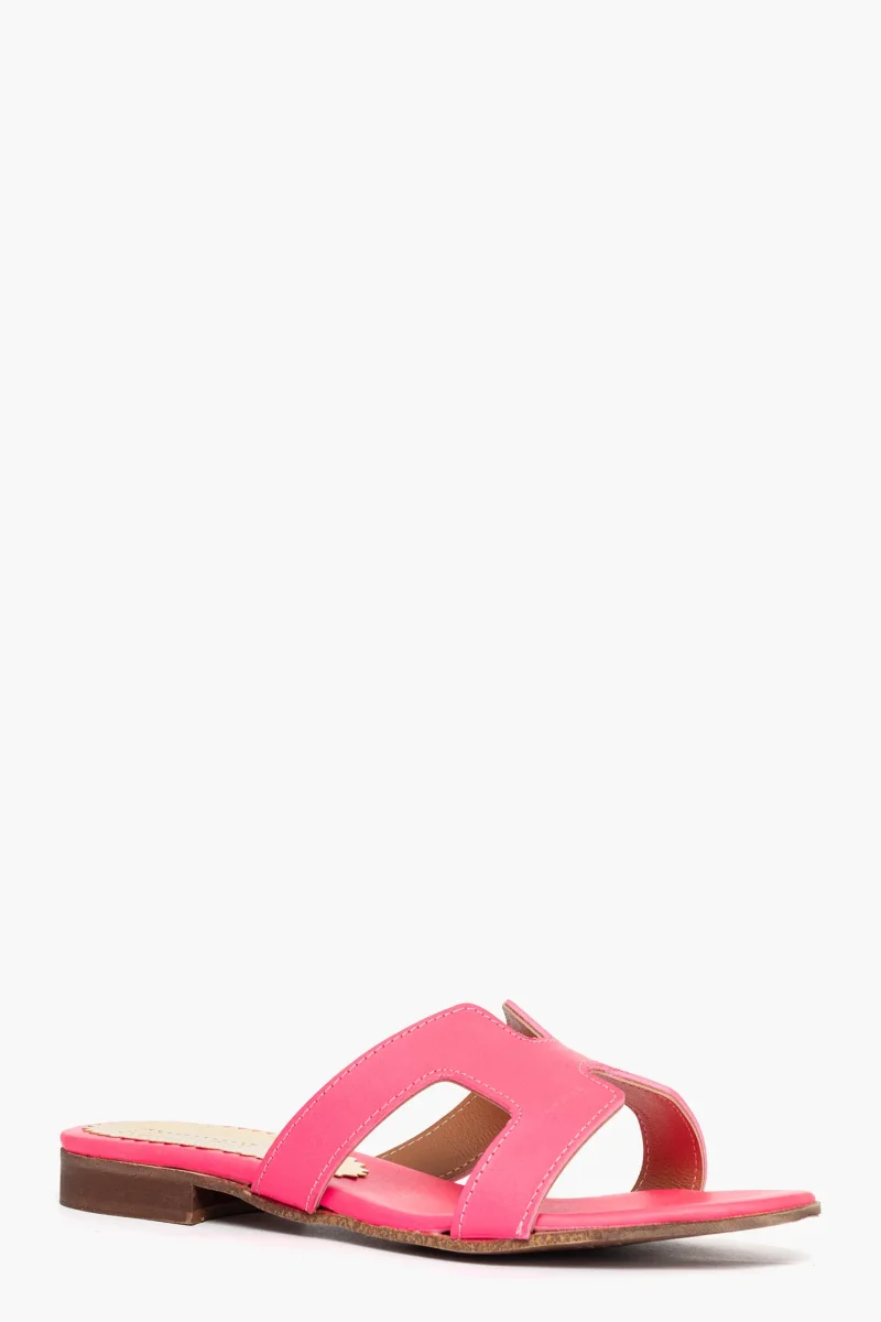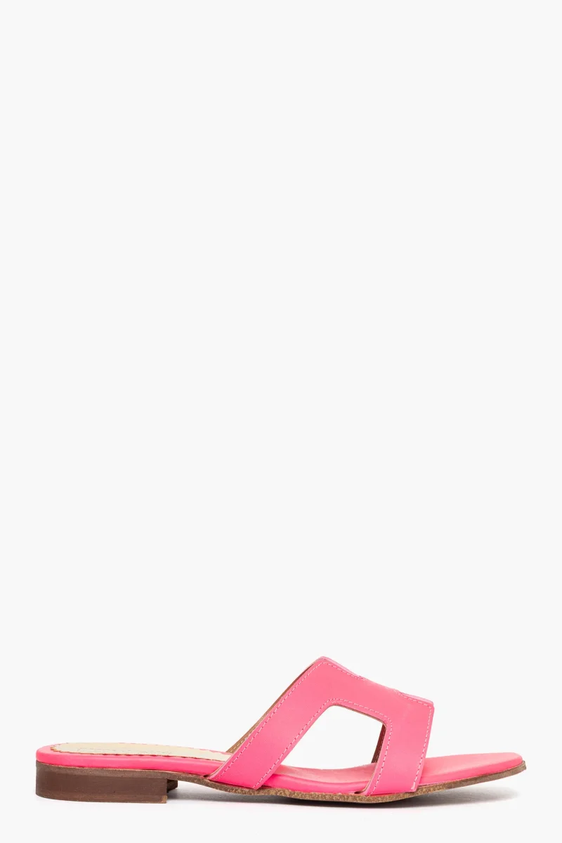 Ciabatte Amalfi in pelle fluo fucsia, sottopiede in pelle fluo fucsia, altezza 1-2 cm. Calzano regolari, taglia italiana. Calzature realizzate artigianalmente, rigorosamente made in Italy.