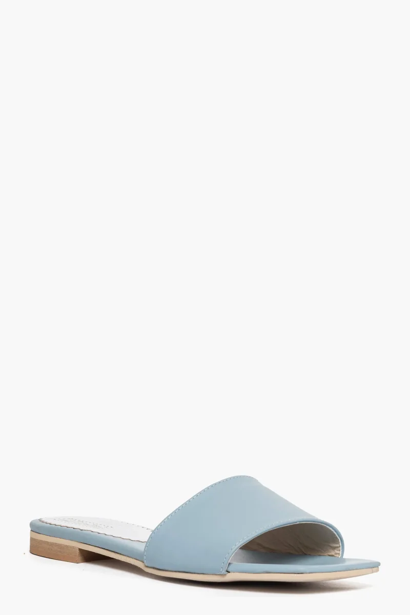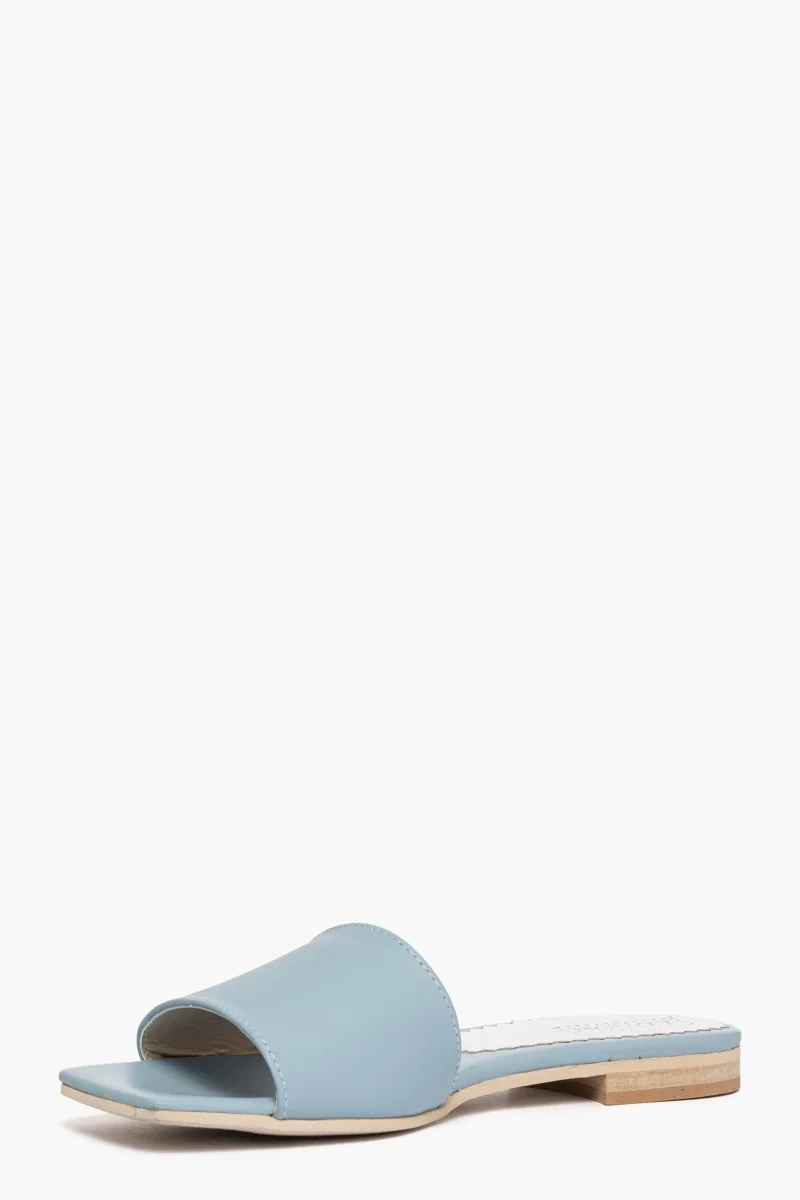 Ciabatte in pelle azzurro con punta quadra e semplice fascia, interni in similpelle, sottopiede in pelle azzurro, suola in thunit neutra, altezza 2 cm. Calzano regolari, taglia italiana. Calzature realizzate artigianalmente, rigorosamente made in Italy.