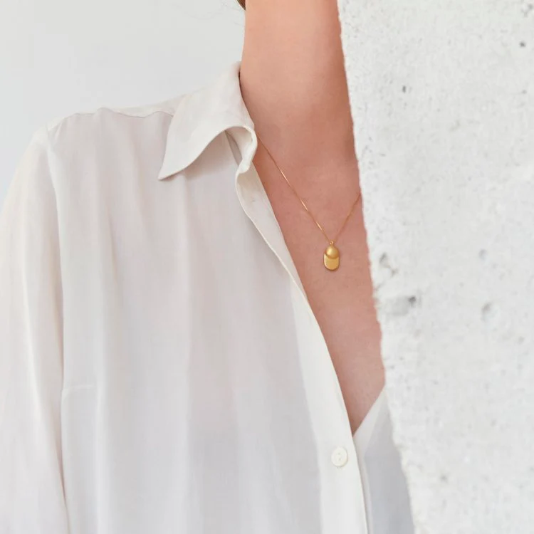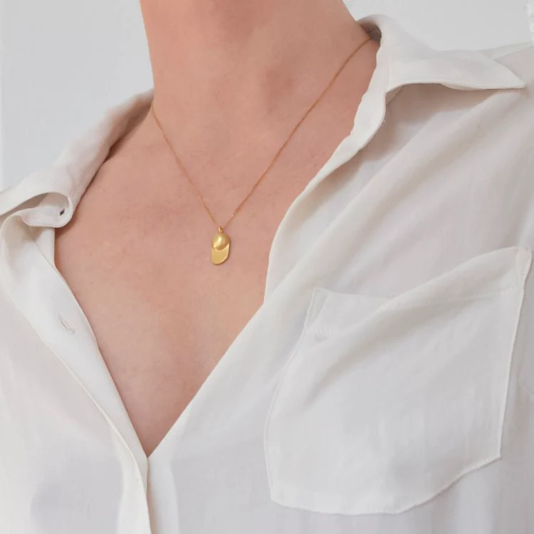 La collana con ciondolo argento BUTTON fa parte della collezione “The way through”. LA STRADA ATTRAVERSO la raccolta “The way through” è una collezione iniziata con un respiro consapevole e l’impegno a perseguire il divertimento e la realizzazione attraverso il processo di progettazione. È composto da pezzi tridimensionali in argento massiccio, placcati in oro grezzo o 24K, con finitura opaca e perle d’acqua dolce che vengono aggiunte ad alcuni dei disegni. Ispirandosi alla modalità della natura di avvolgere forme e forme in modo minimale e senza sforzo, la collezione cerca di trovare il punto debole tra la dichiarazione e i gioielli classici senza tempo.