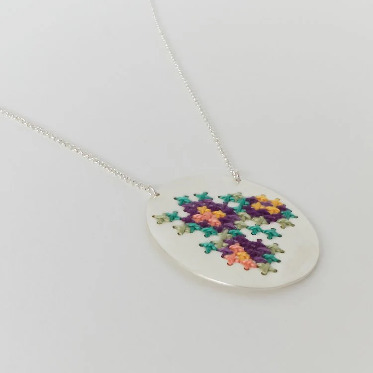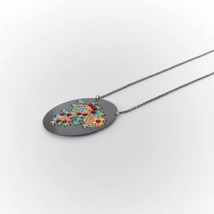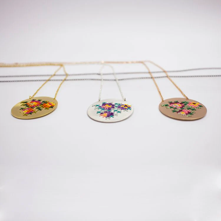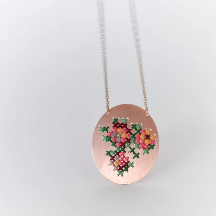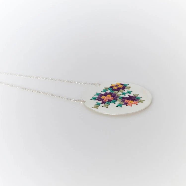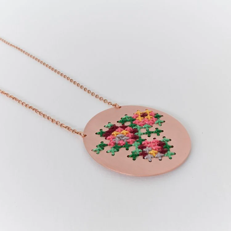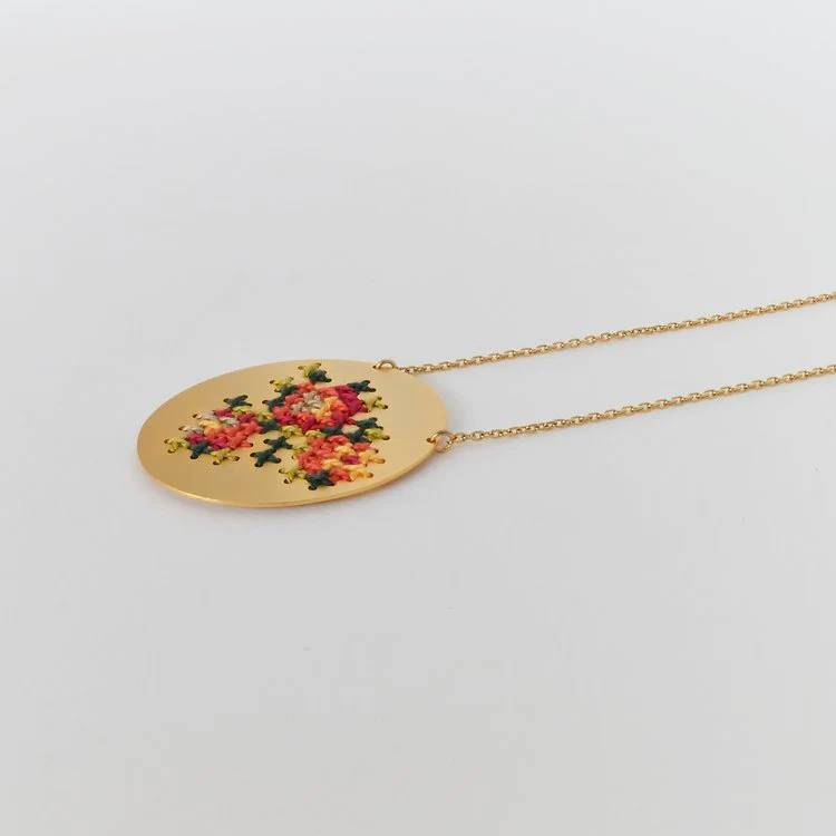 La collana con ciondolo rotondo Embroderied fa parte della collezione omonima ispirata alla famiglia e alla cultura greca. Infatti la collana in ottone placcato, presenta il tipico ricamo greco con filo. “I greci si riuniscono intorno a un tavolo ogni domenica a mezzogiorno. È il pasto domenicale che riunisce la famiglia per aggiornarsi sulle novità della settimana di tutti. Durante quelle riunioni domenicali a casa mia usavamo sempre la tovaglia ricamata della nonna”.
