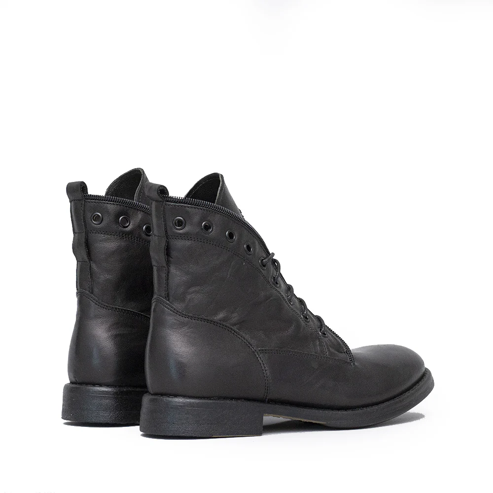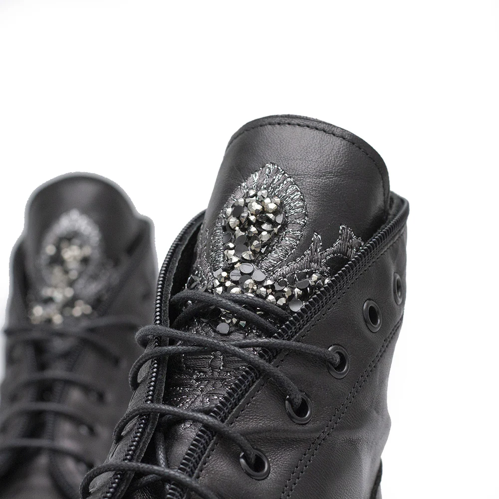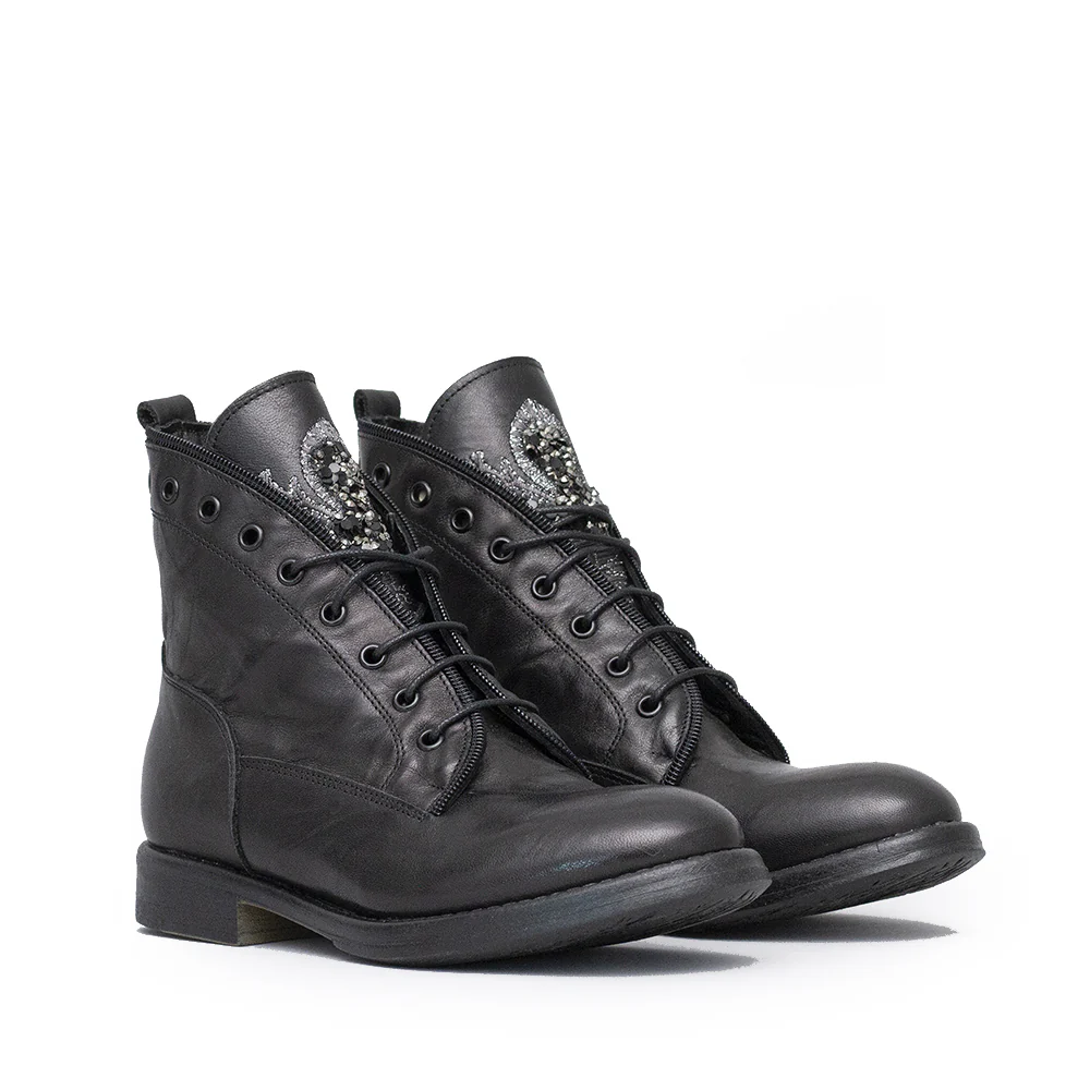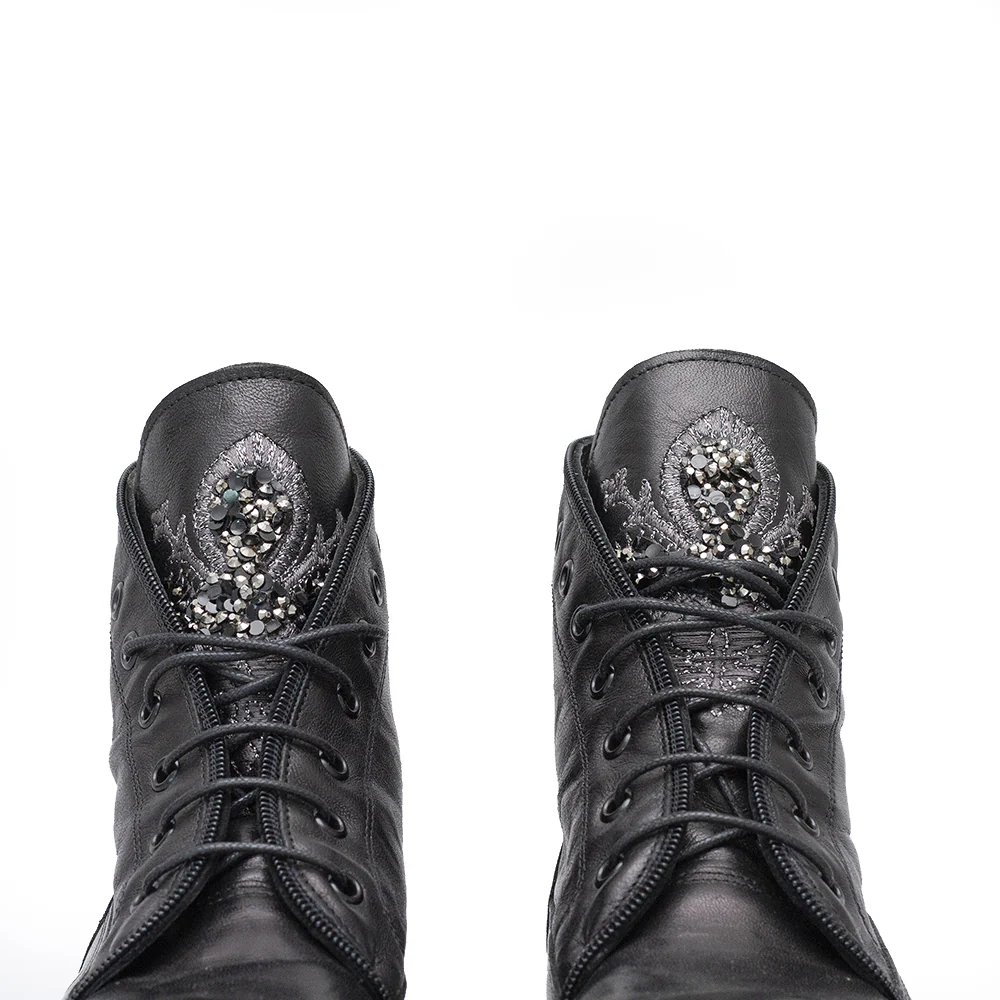 Stivale made in italy anfibio in vera pelle made in italy con pietre su linguetta. Allacciatura in cotone e zip interna. Tacco 3,5 cm e gambale 18 cm.