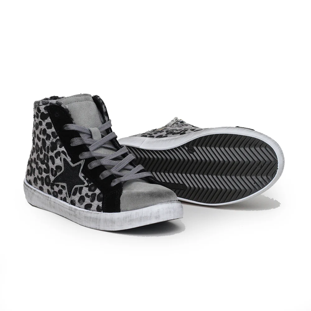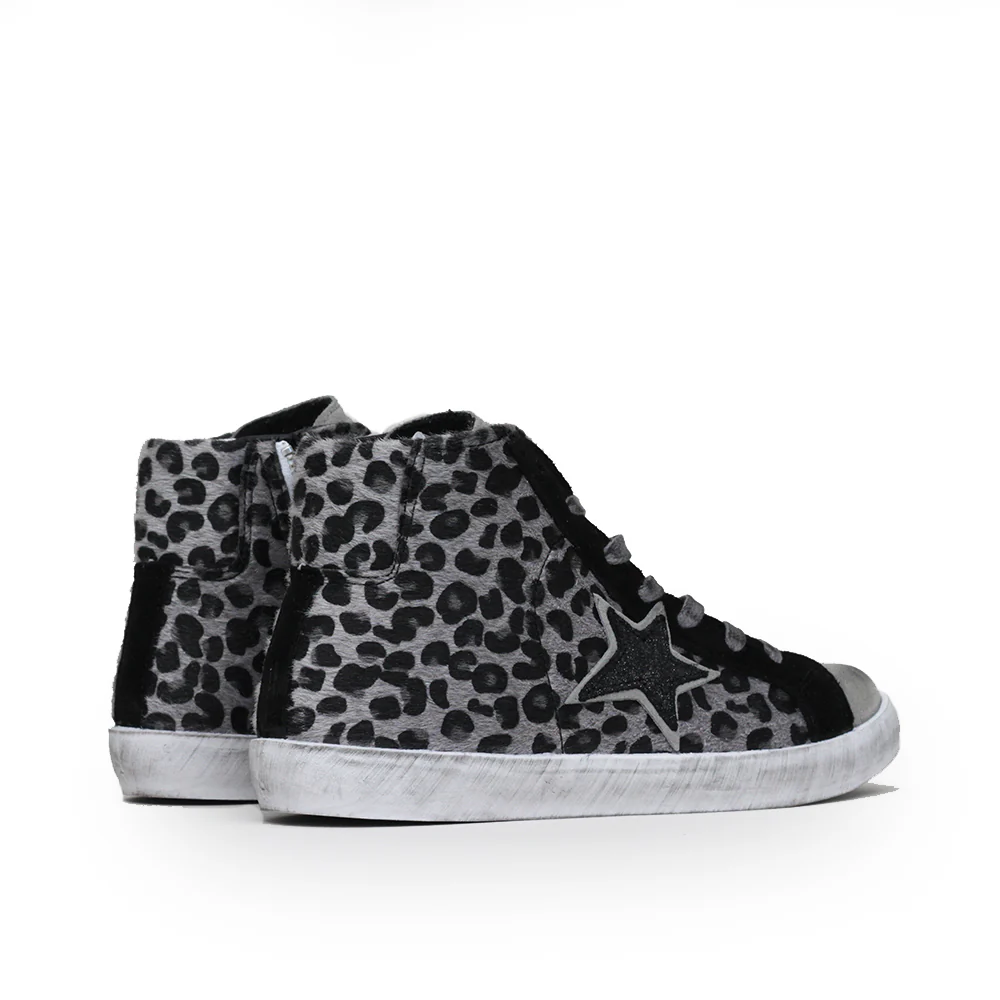 Sneakers made in italy alta con tomaia in stampato leopardo, dettagli e stella in camoscio grigio e nero. Zip interna per calzata. Tacco 2 cm. Gambale 11 cm.