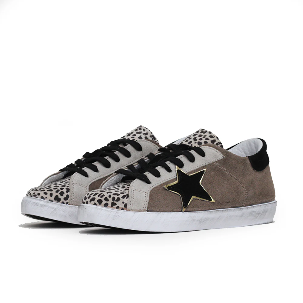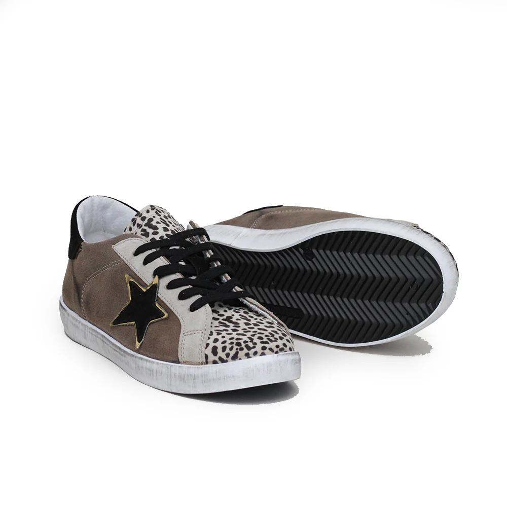Sneakers made in italy bassa con tomaia in pelle e camoscio bianco,taupe e nero. Stella dorata e tallone in pitone stampato. Tacco 2 cm.