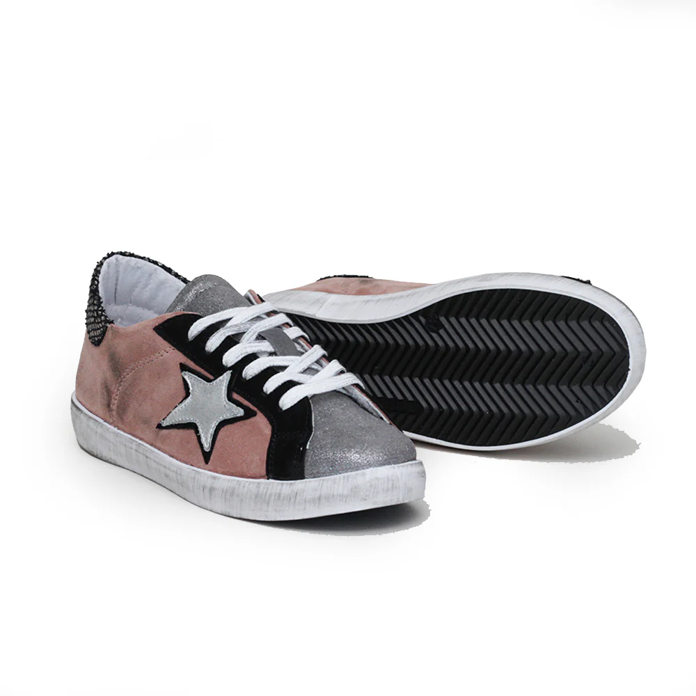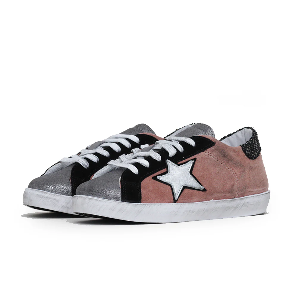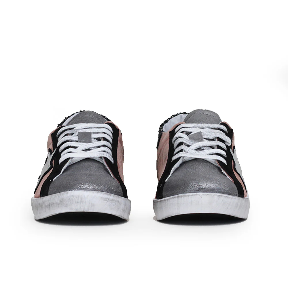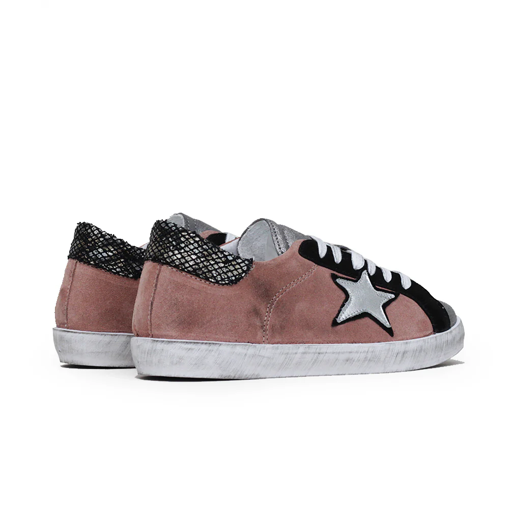 Sneakers made in italy bassa con tomaia in pelle scamosciata rosa scuro, grigio e nero. Dettaglio serpente su tallone. Tacco 2 cm.
