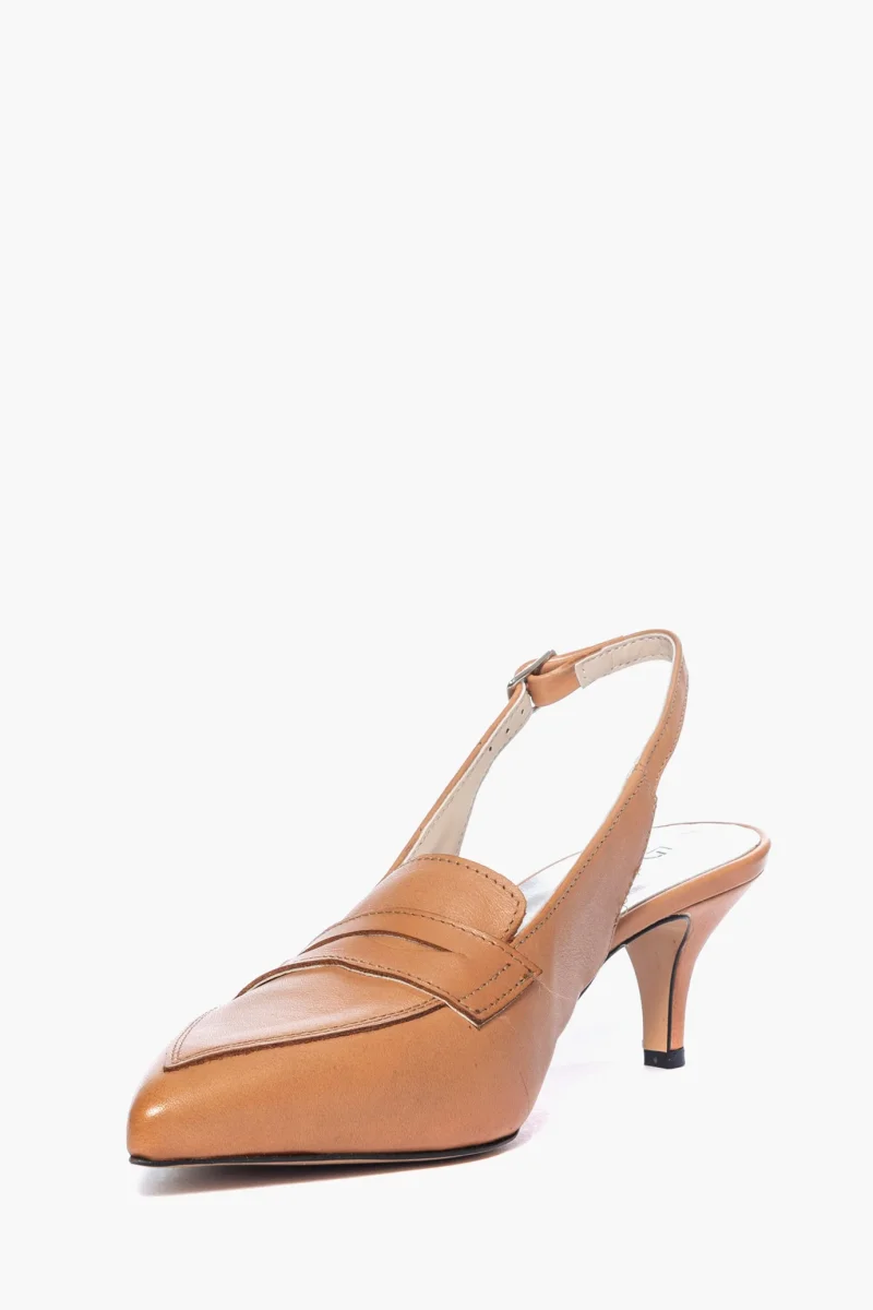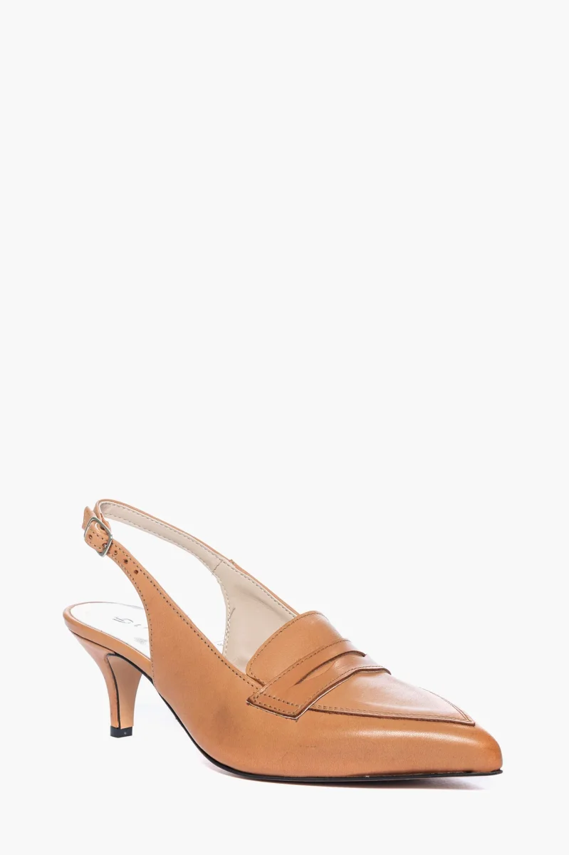 Décolleté in pelle cuoio, cinturino al tallone con fibbietta nel color argento, tacco rivestito in pelle in tinta, altezza 6 cm, interni e sottopiede in similpelle. Calzata regolare, punta leggermente stretta in stile mocassino. Calzature realizzate in modo artigianale, rigorosamente made in Italy.