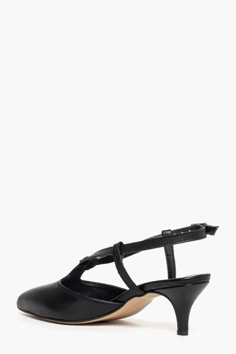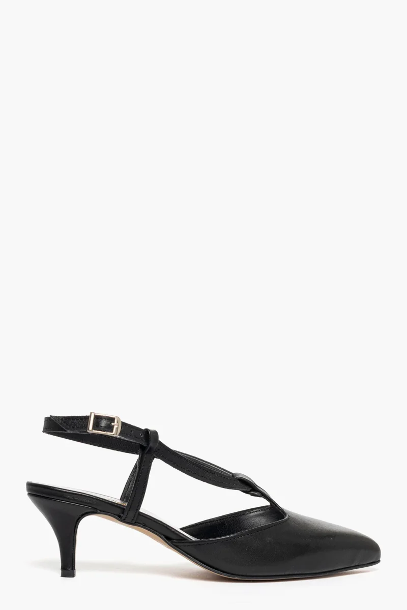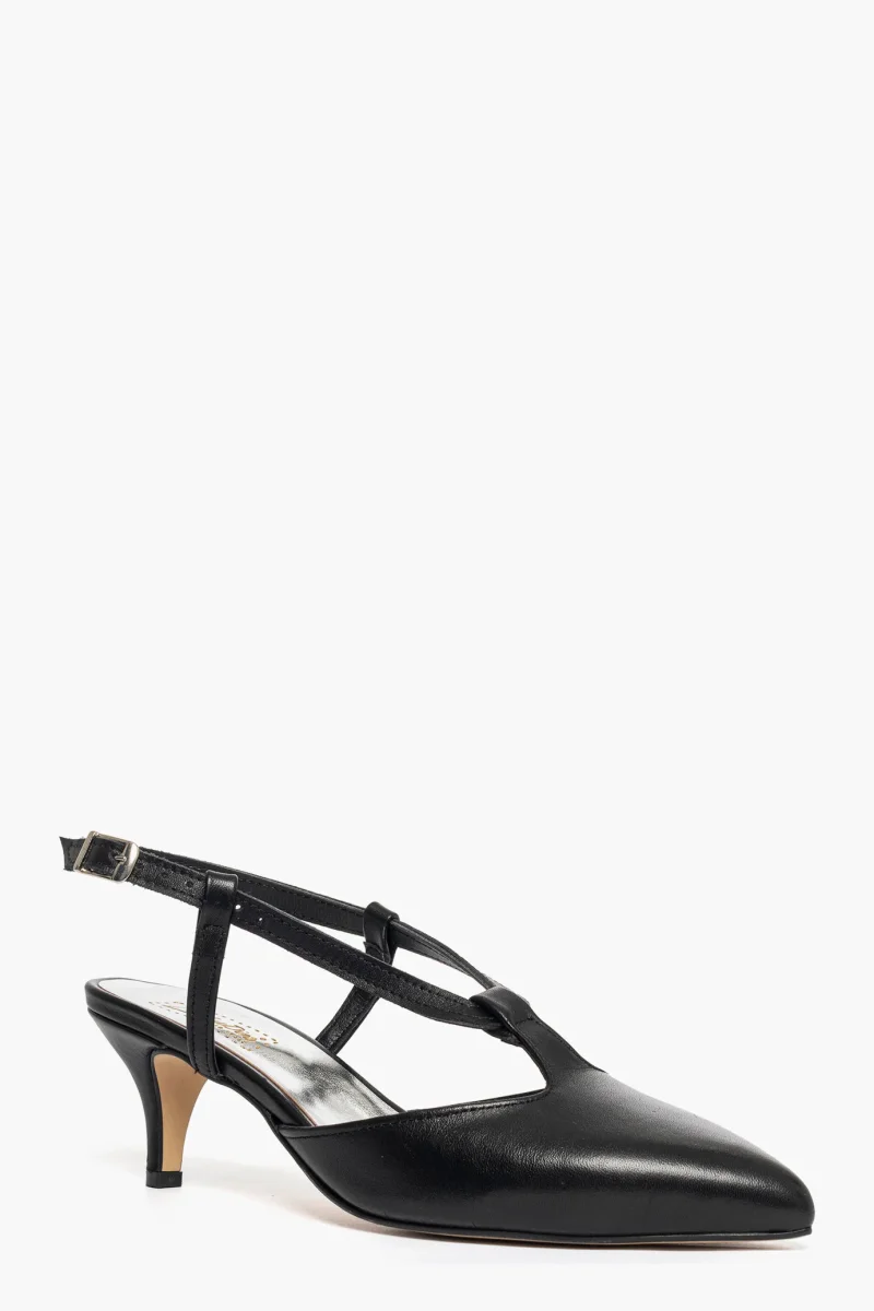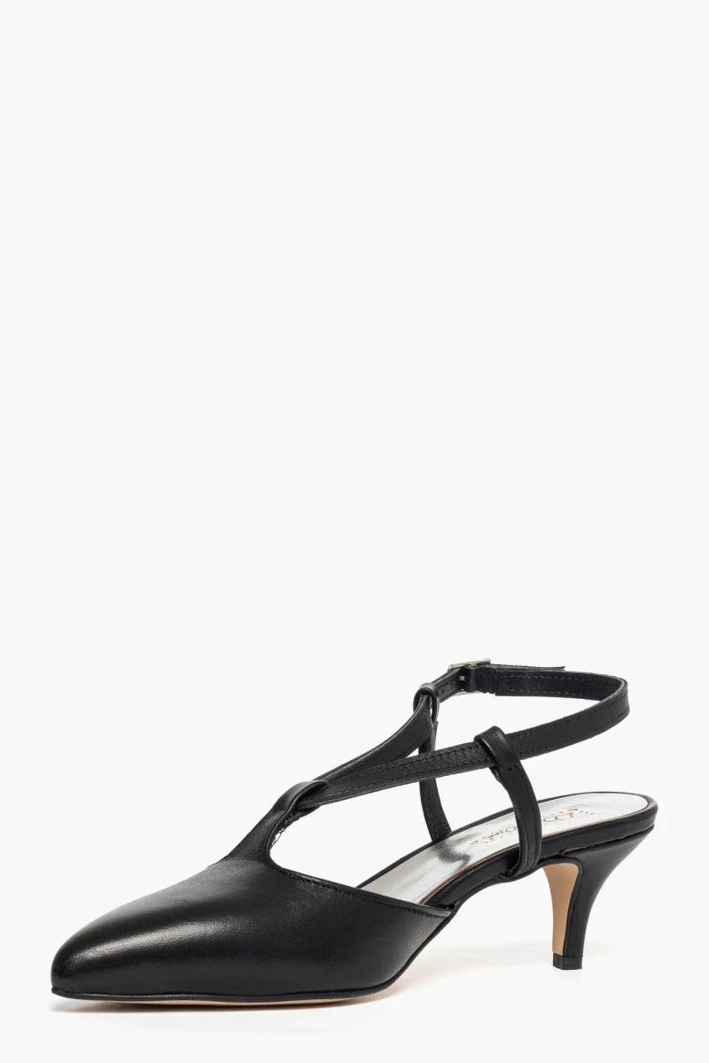 Décolleté pelle nero aperto al tallone con cinturino regolabile e fibbietta nel colore argento, tacco rivestito, 6, interni in similpelle. Calzano regolari. Calzature artigianali, made in Italy.
