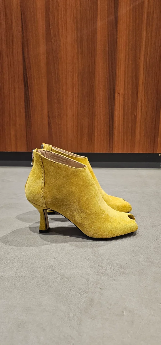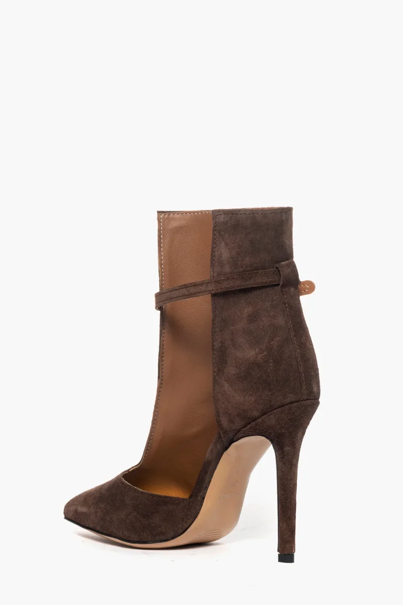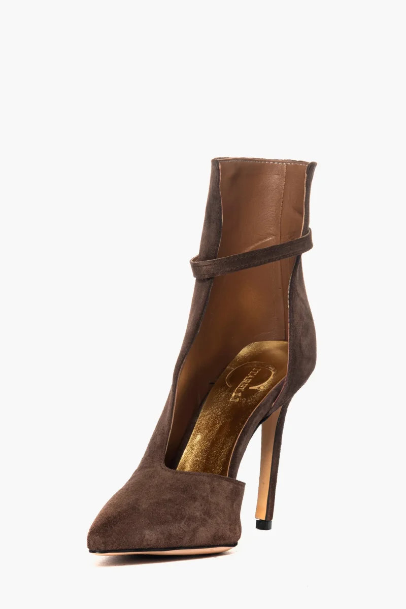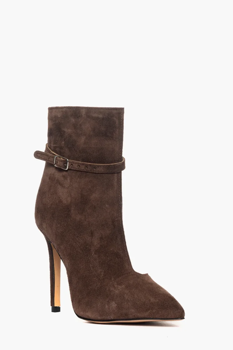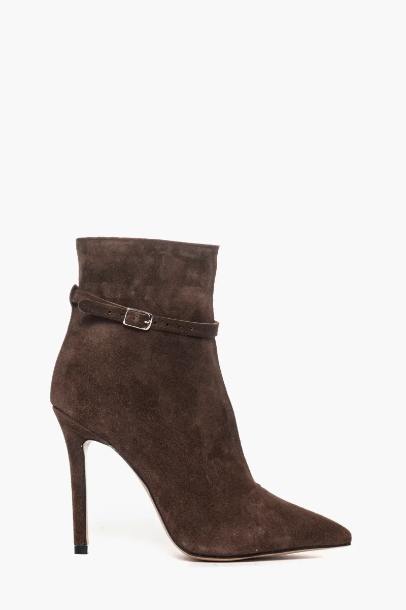 Tronchetto scollato in camoscio cioccolato con cinturino altezza sopra alla caviglia, con tacco rivestito, interni in similpelle, altezza 11. Calzano regolari.